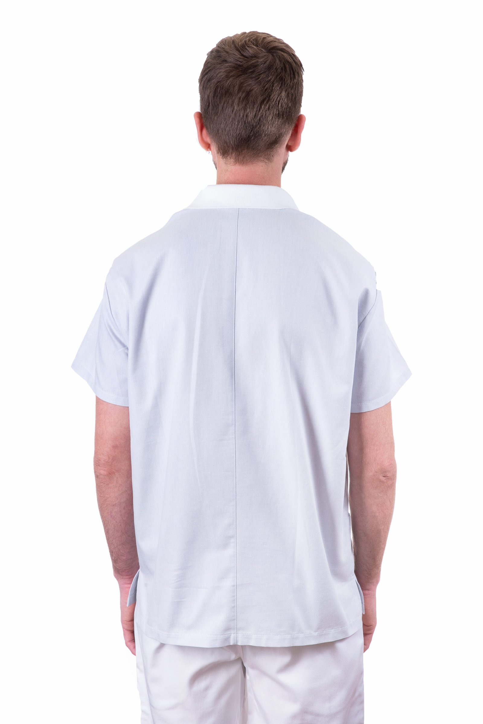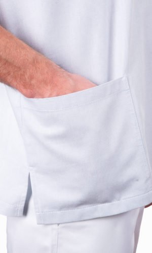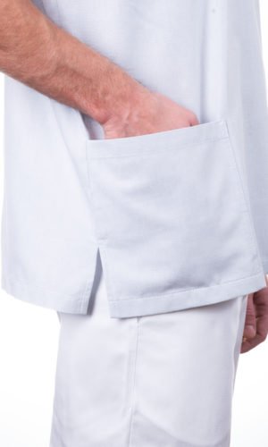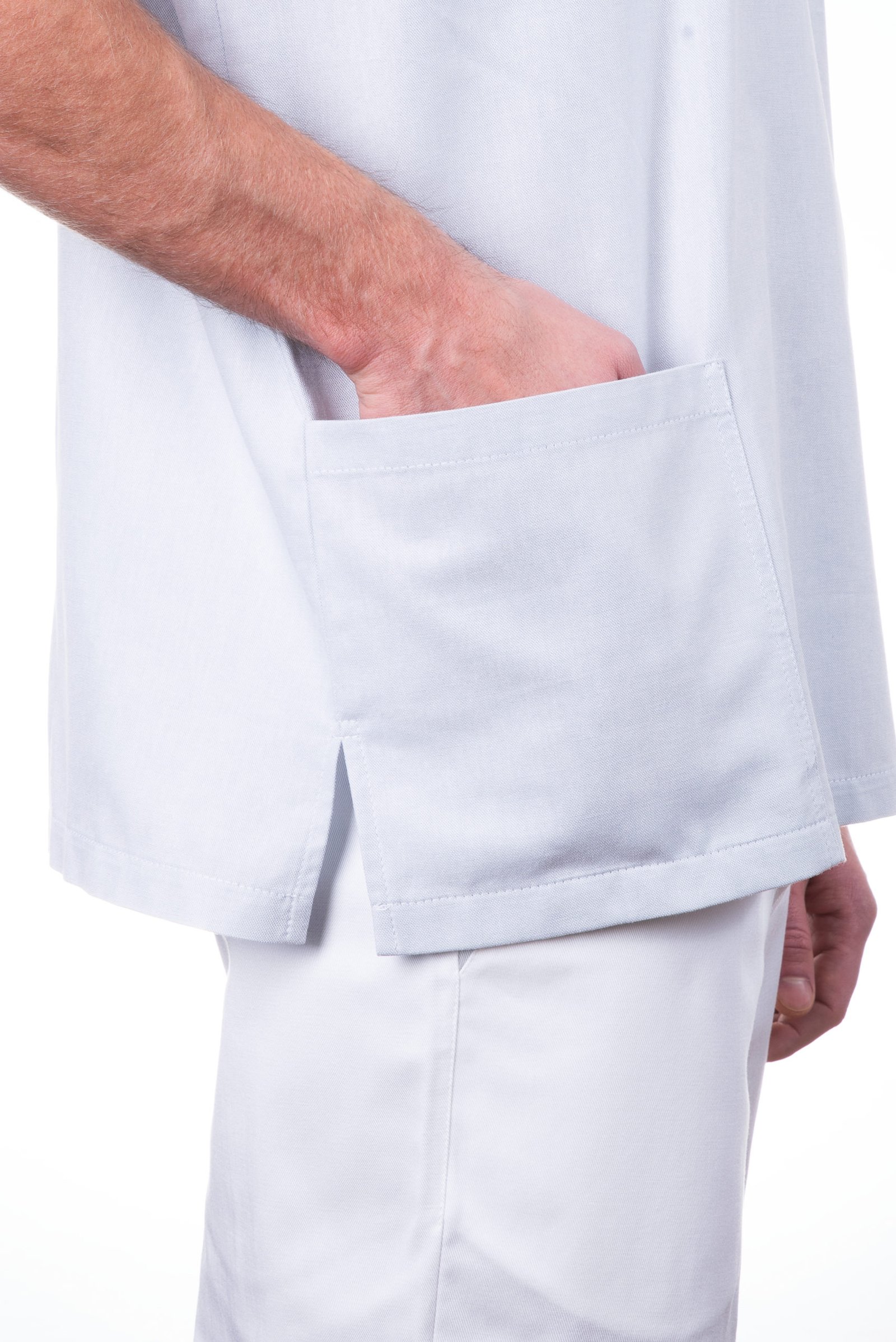 Unisexbussarong med krage i avvikande tyg, kort öppning fram med tryckknapp. Bröstficka och två stora fickor samt sidsprund. Krage sys i vitt om inget annat önskas.