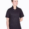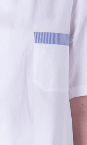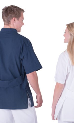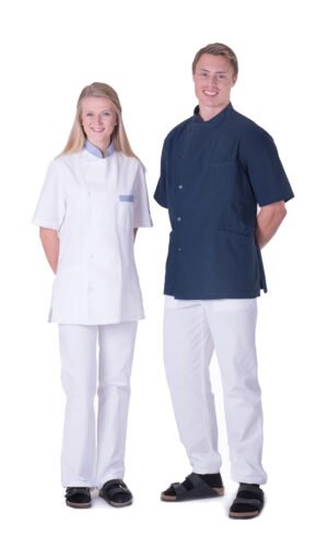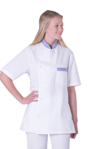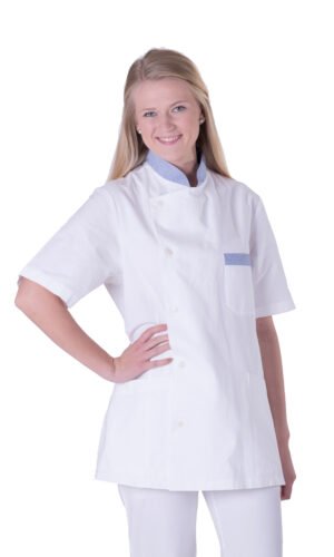 Damjacka med sned knäppning. Korta ärmar, en bröstficka och två stora fickor fram. Sidsprund och slejf bak. Grundmodellen är enfärgad. Notera att modellen är sydd med färgtillägg på krage och bröstfickskant. Färgtilläggskostnad tillkommer.