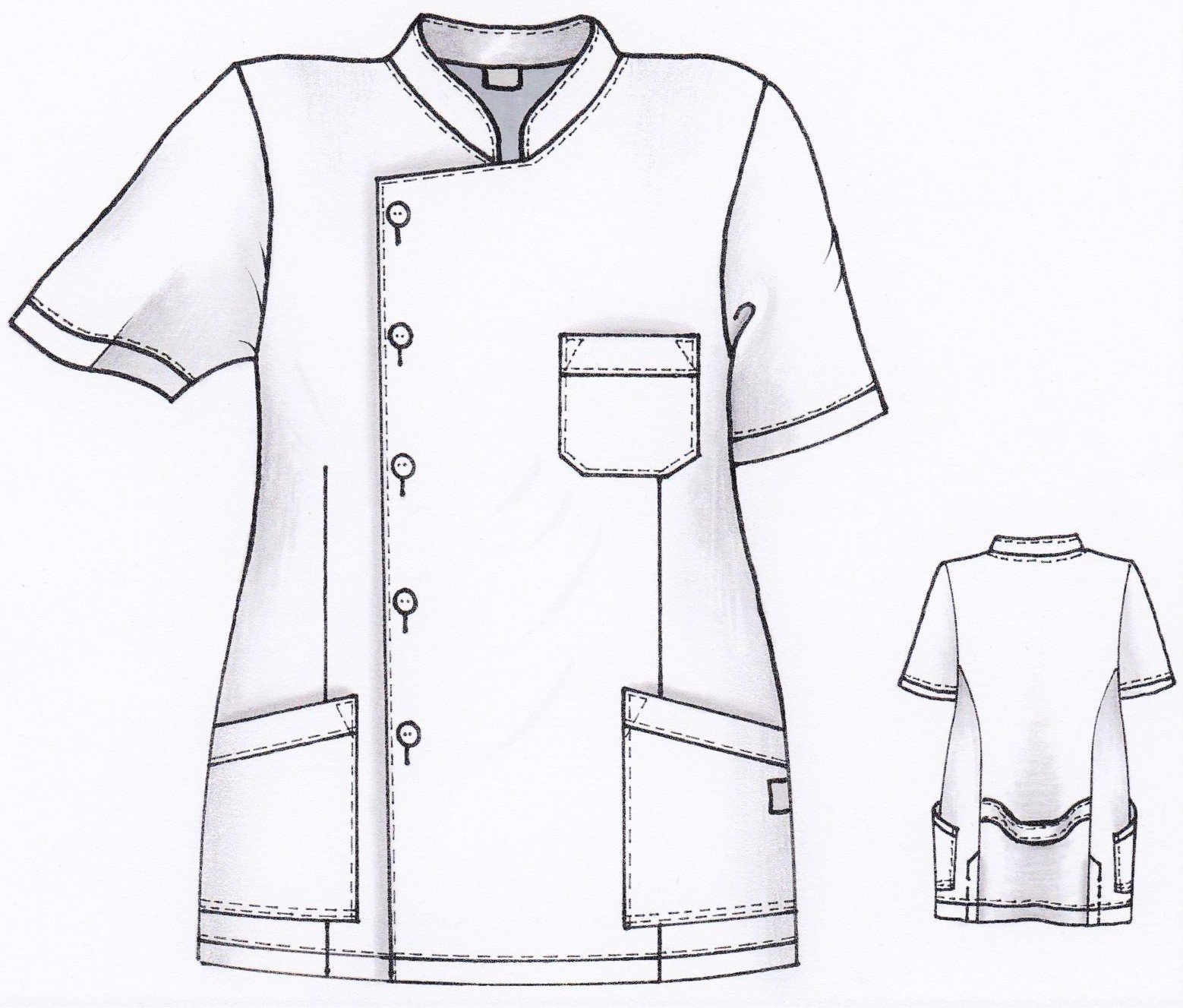 Damjacka med sned knäppning. Korta ärmar, en bröstficka och två stora fickor fram. Sidsprund och slejf bak. Grundmodellen är enfärgad. Notera att modellen är sydd med färgtillägg på krage och bröstfickskant. Färgtilläggskostnad tillkommer.