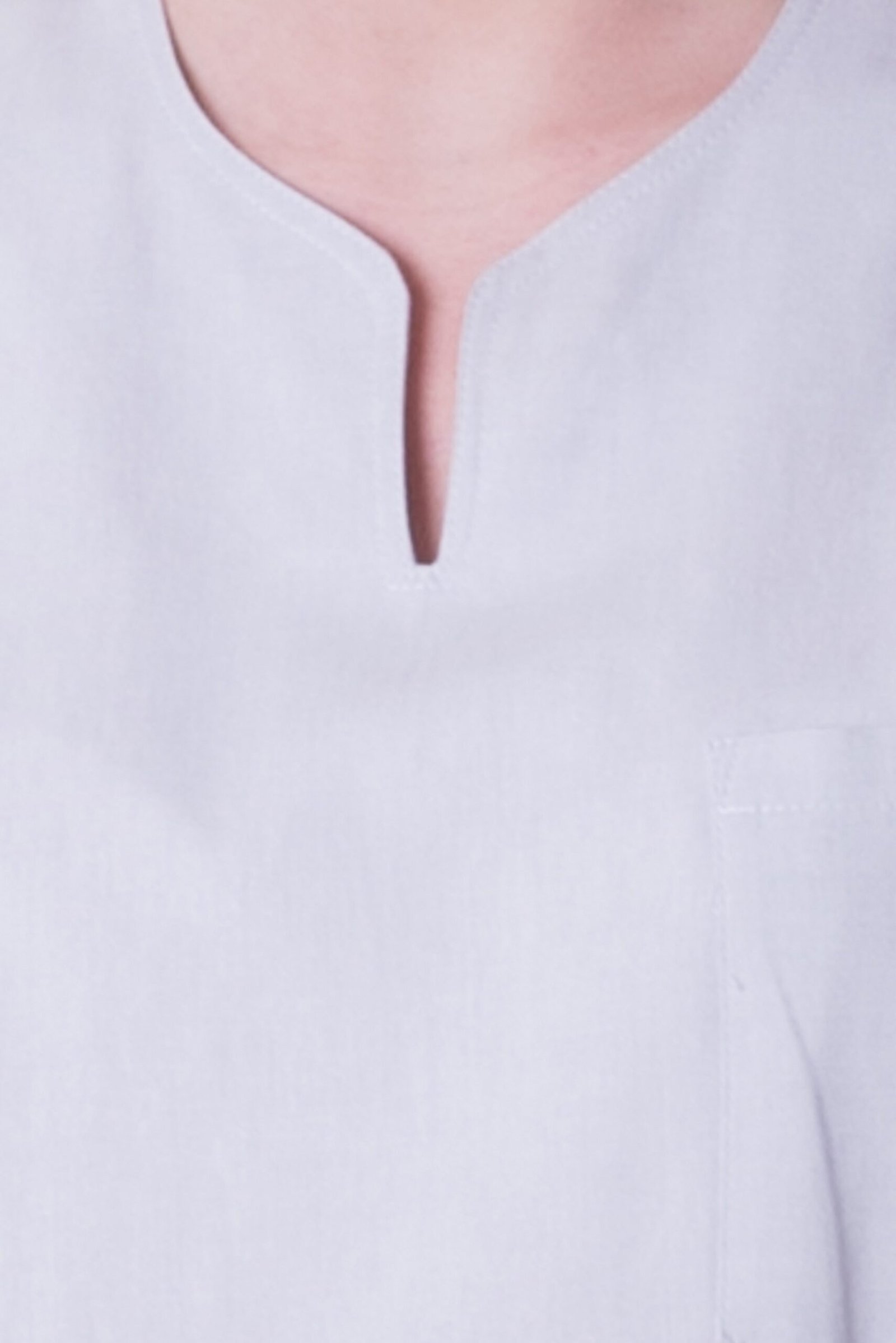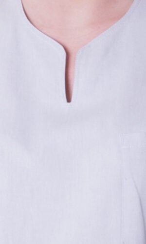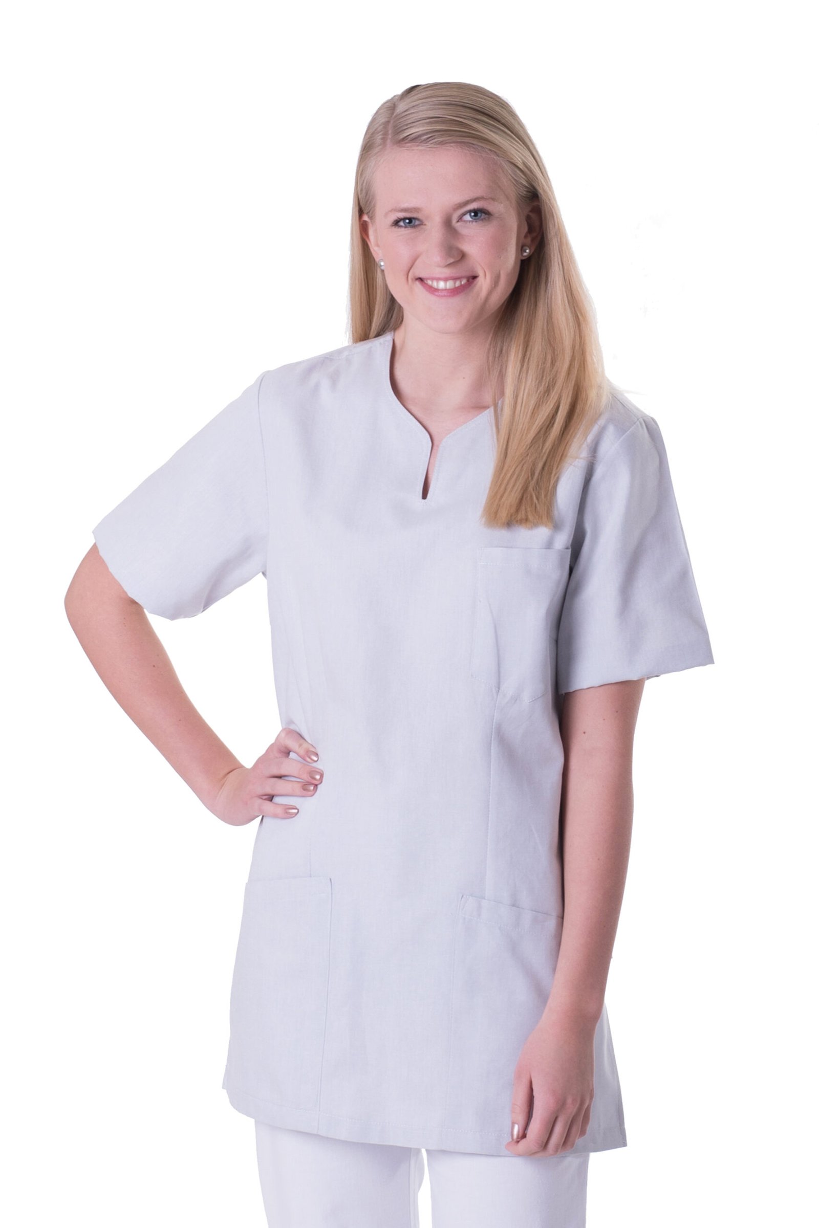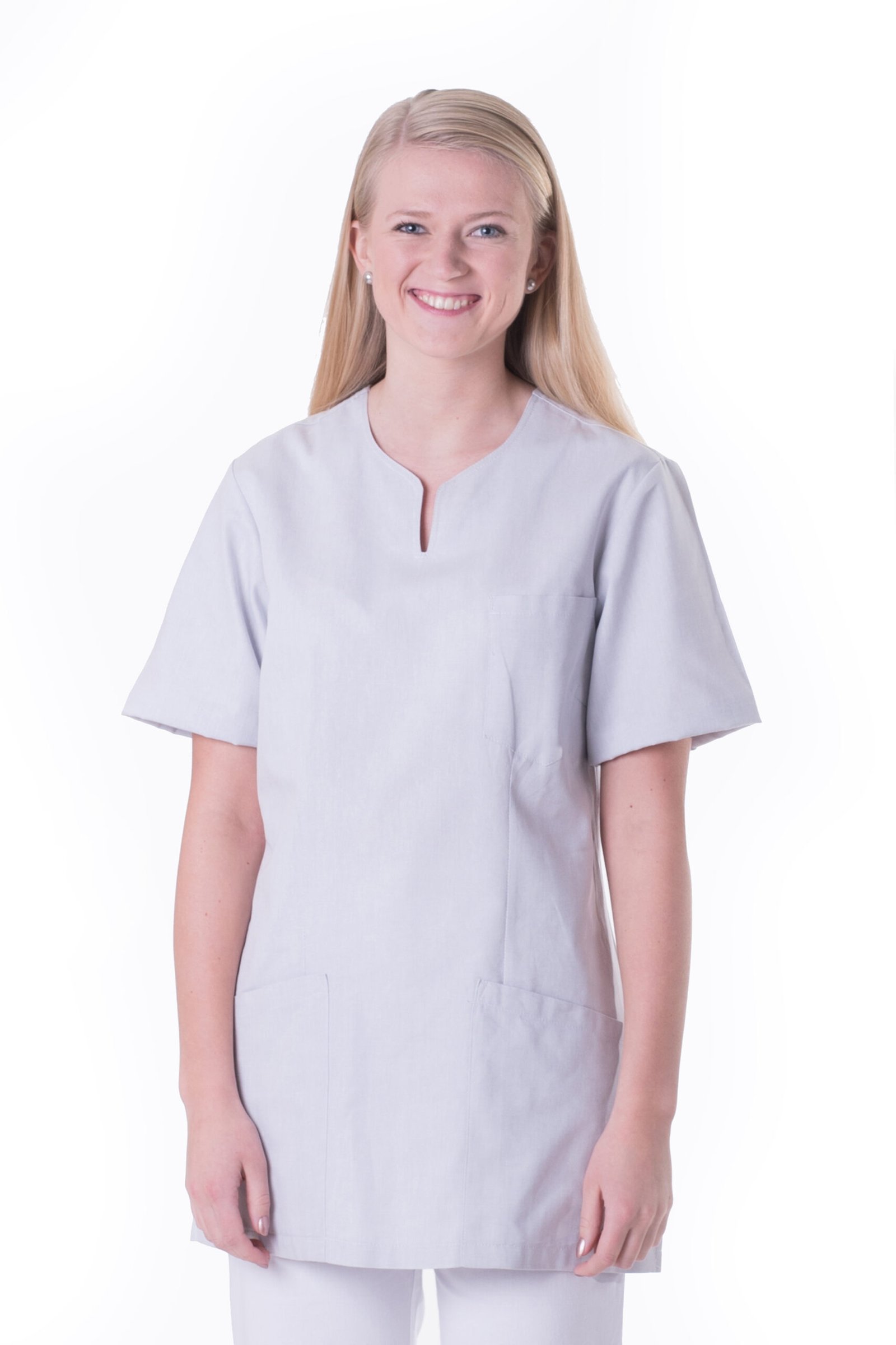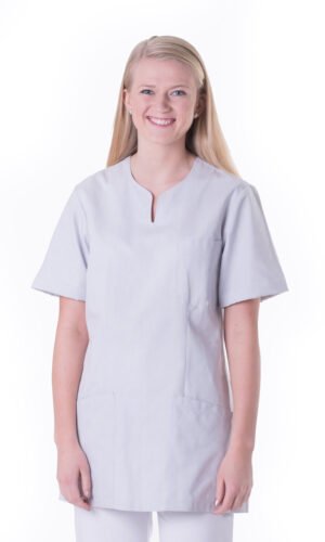 Damtunika i lätt figursyddmodell. Sprund mitt fram. Kort ärm, bröstficka, två stora fickor samt sidsprund.