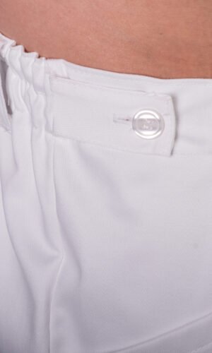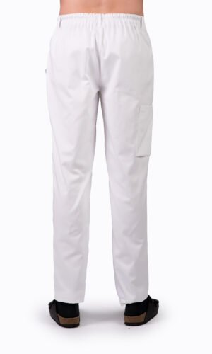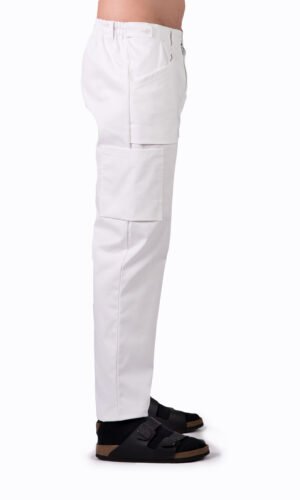 Herrbyxa i rak modell med resår bak, två veck fram och reglerbar midja. Gylf och rymliga utanpåfickor med bälgveck samt benficka på höger ben. Hällor. Fotvidd 40 cm i stl M.