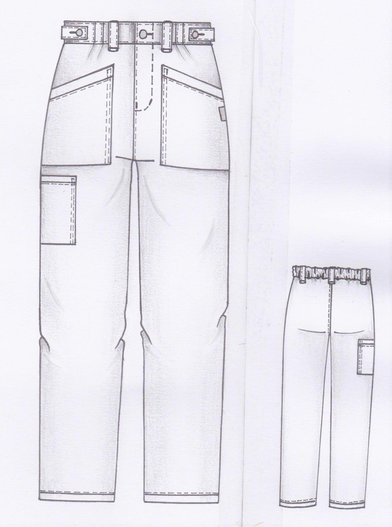 Herrbyxa i rak modell med resår bak, två veck fram och reglerbar midja. Gylf och rymliga utanpåfickor med bälgveck samt benficka på höger ben. Hällor. Fotvidd 40 cm i stl M.
