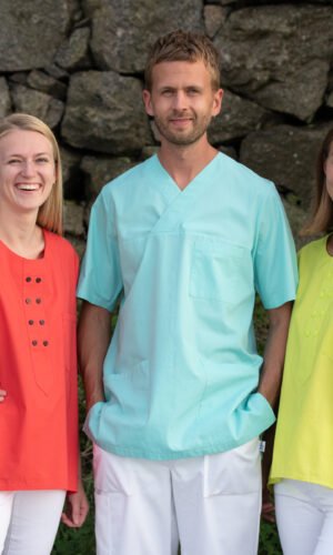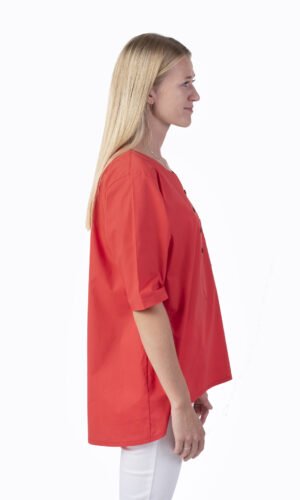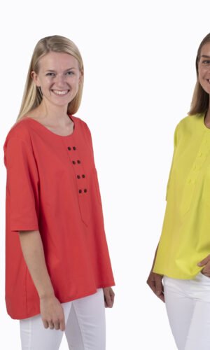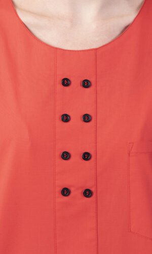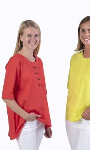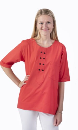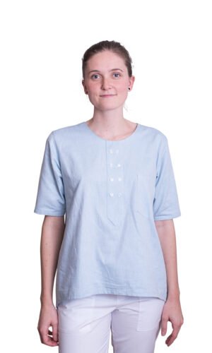 Damtunika i A-formad modell. Låtsasknäppning mitt fram. Kort ärm och bröstficka. Levereras med vit knapp. Önskas någon annan färg annat kontakta oss. OBS: tunikan har inget sprund som standard, men önskar du det så löser vi det förstås!