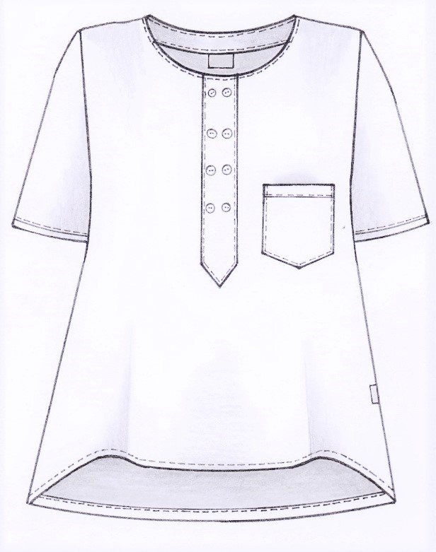 Damtunika i A-formad modell. Låtsasknäppning mitt fram. Kort ärm och bröstficka. Levereras med vit knapp. Önskas någon annan färg annat kontakta oss. OBS: tunikan har inget sprund som standard, men önskar du det så löser vi det förstås!