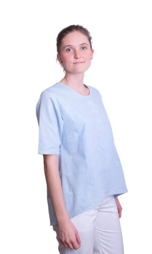 Damtunika i A-formad modell. Låtsasknäppning mitt fram. Kort ärm och bröstficka. Levereras med vit knapp. Önskas någon annan färg annat kontakta oss. OBS: tunikan har inget sprund som standard, men önskar du det så löser vi det förstås!