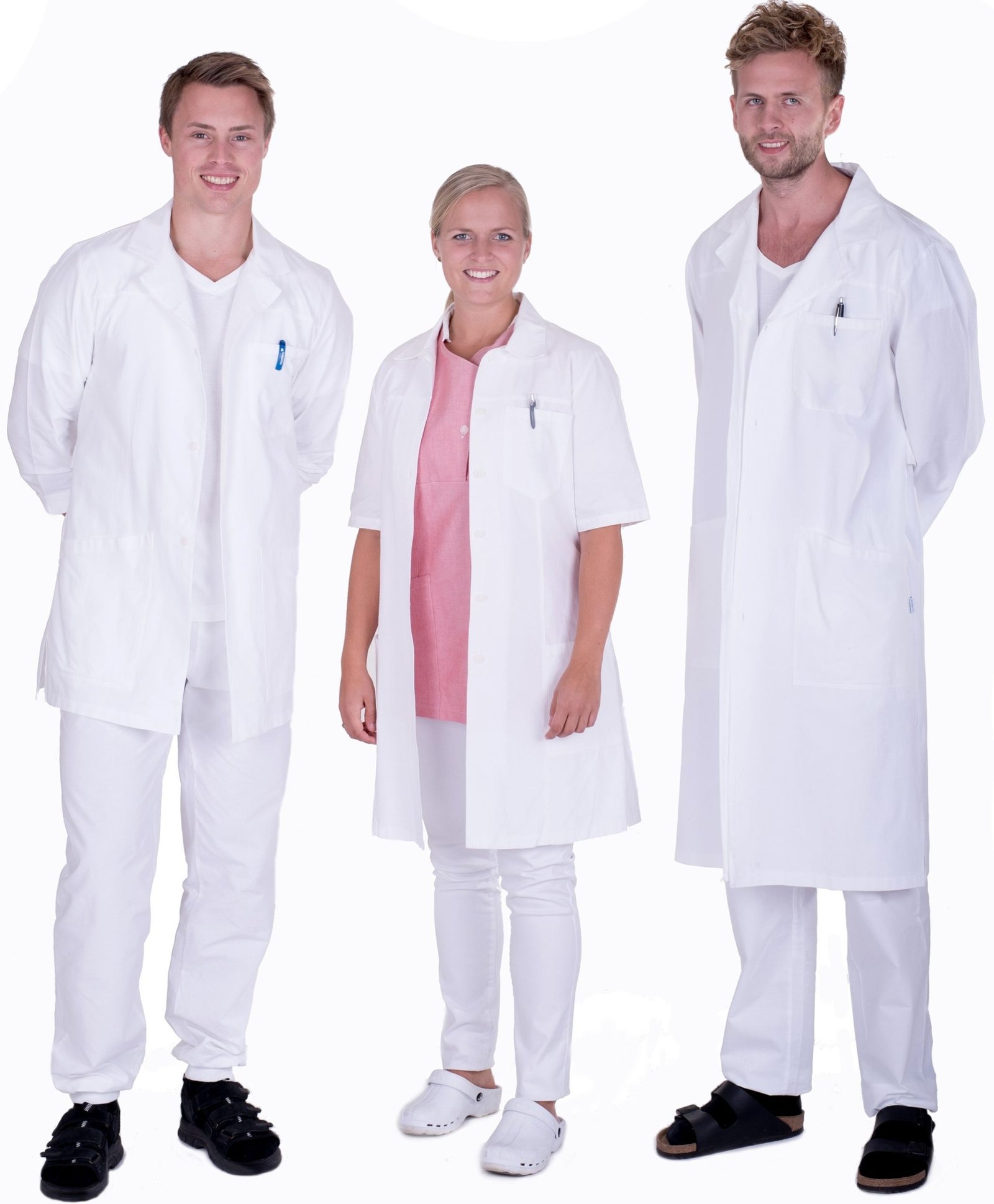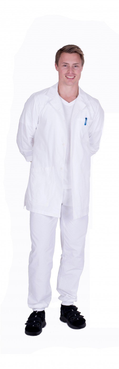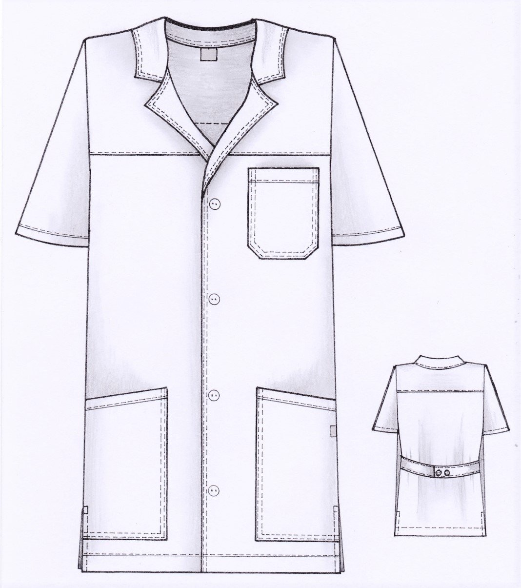 Kort rock i rak unisexmodell. Lång ärm, ok fram och bak, två stora fickor, en bröstficka samt slejf i ryggen med två knappar. Rocken finns också i lång modell 5501L.
