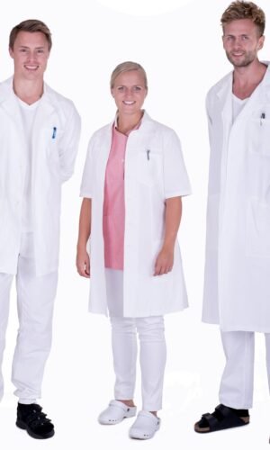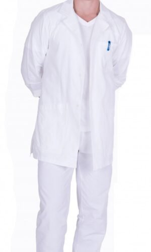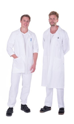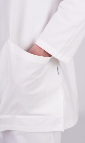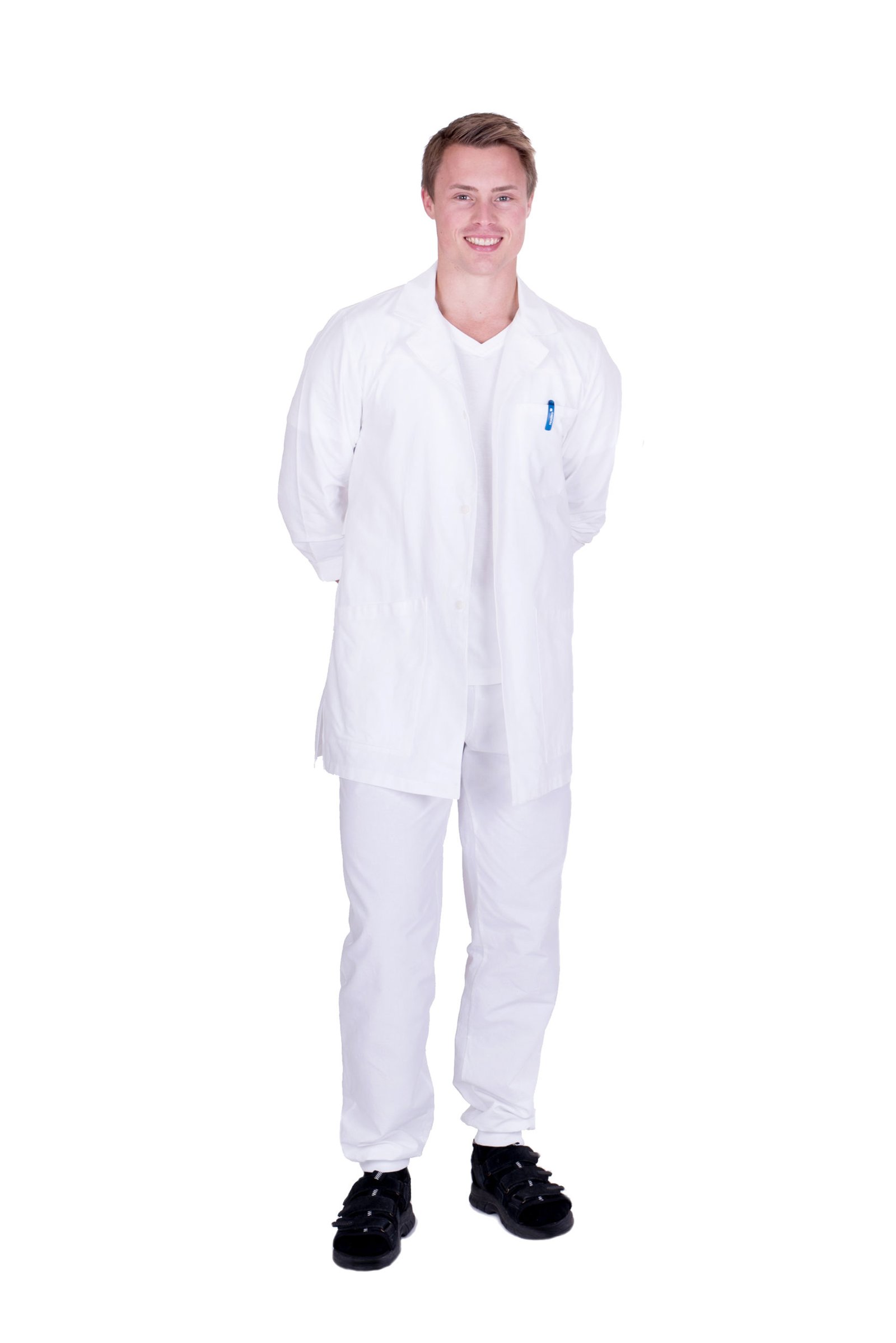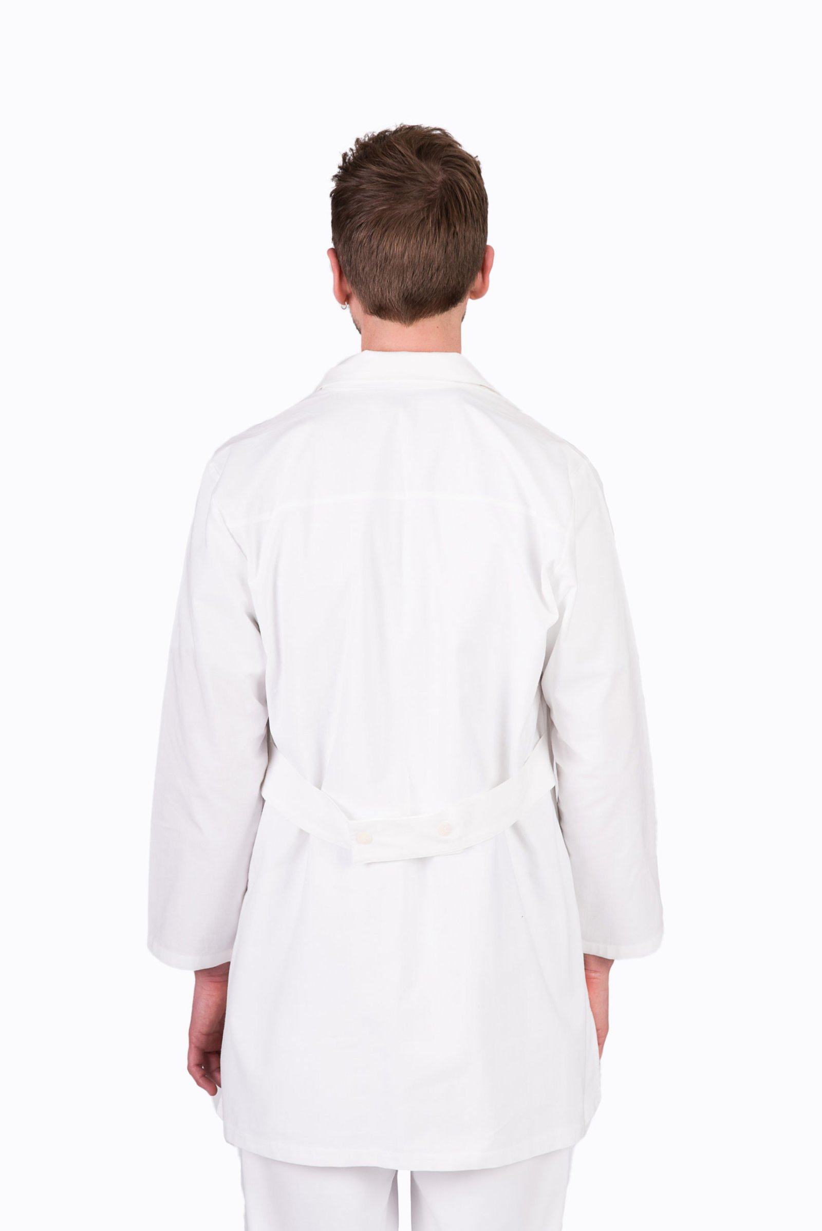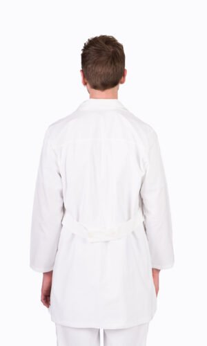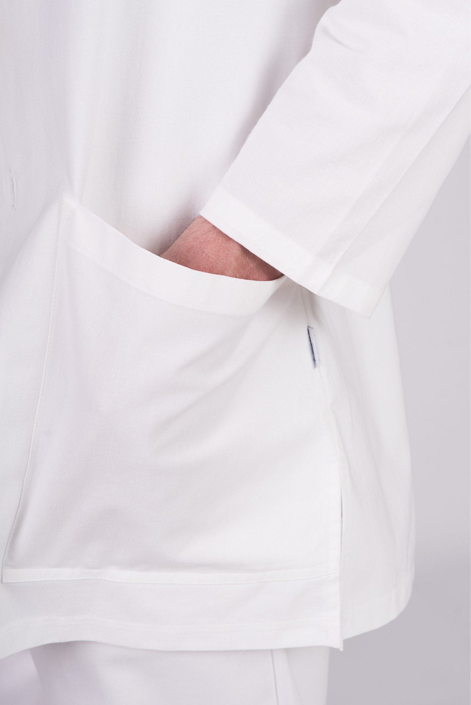Kort rock i rak unisexmodell. Lång ärm, ok fram och bak, två stora fickor, en bröstficka samt slejf i ryggen med två knappar. Rocken finns också i lång modell 5501L.