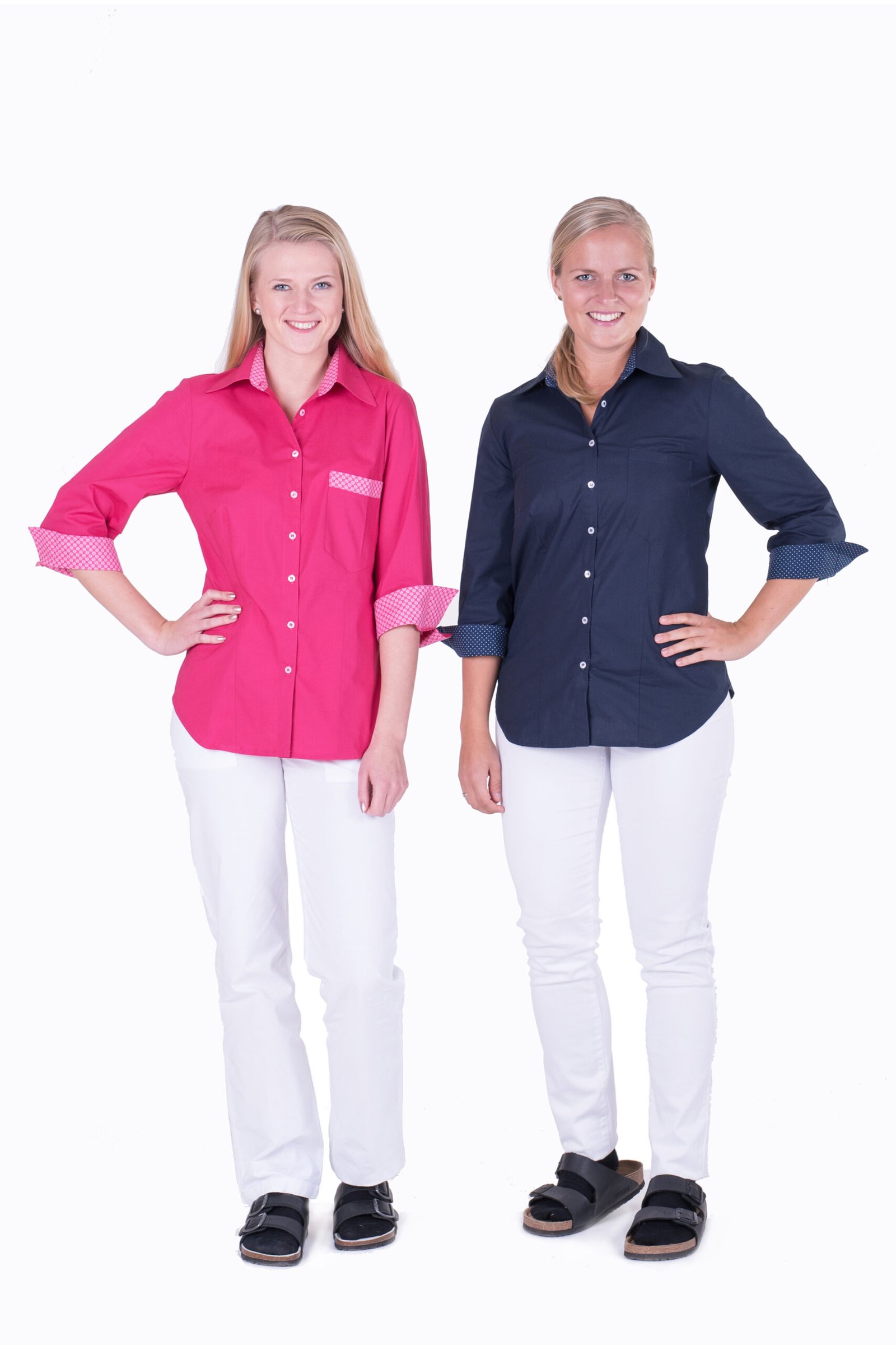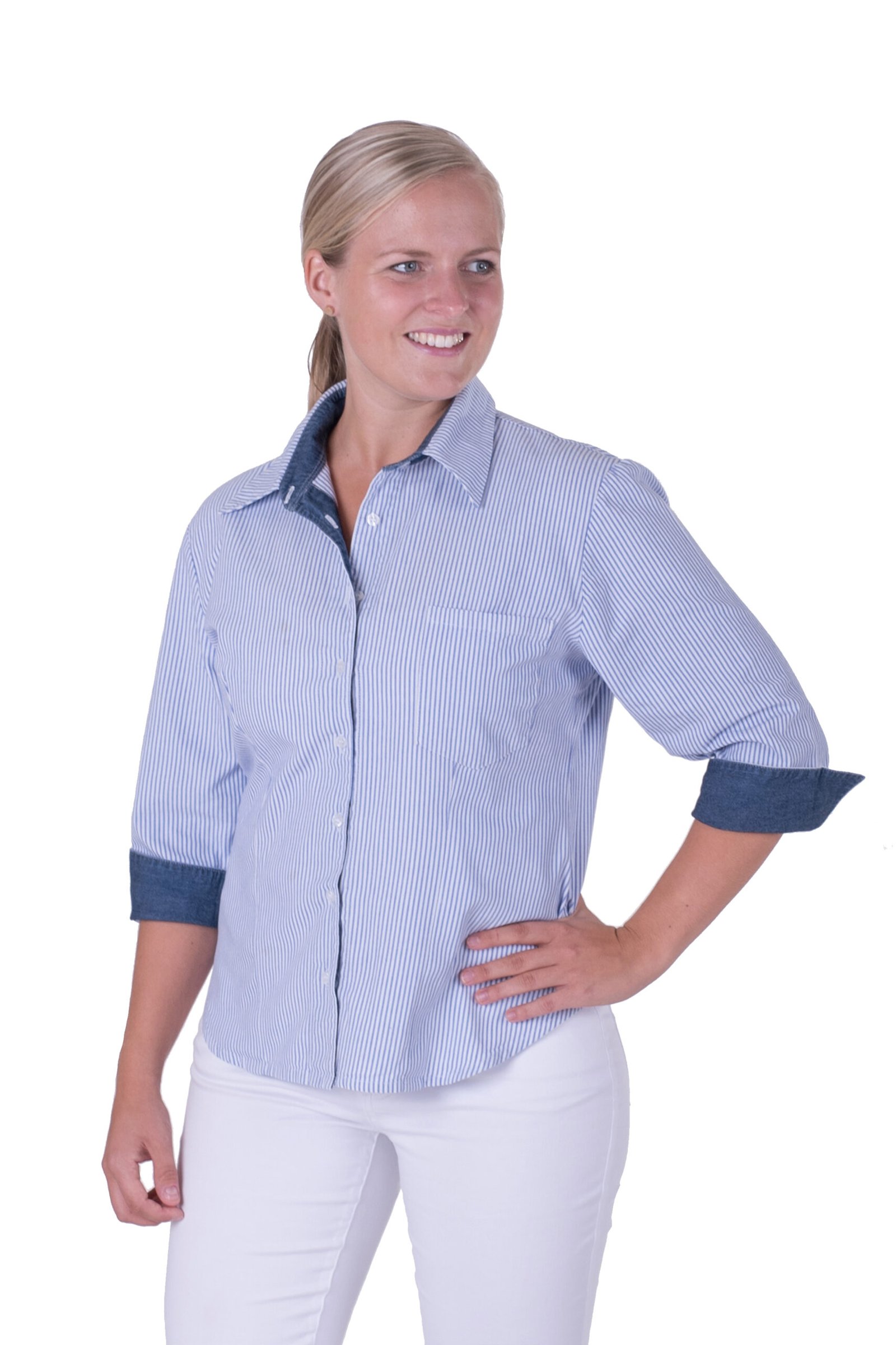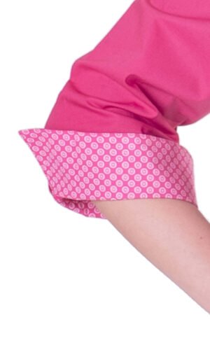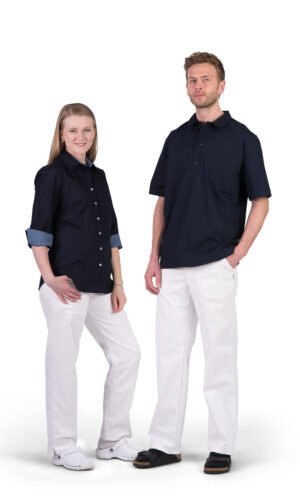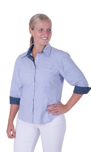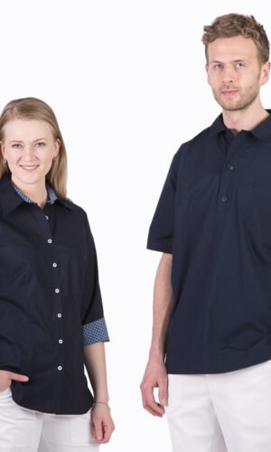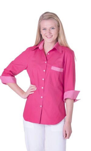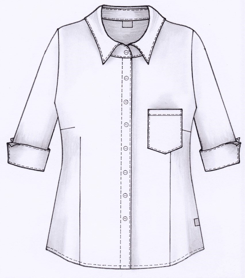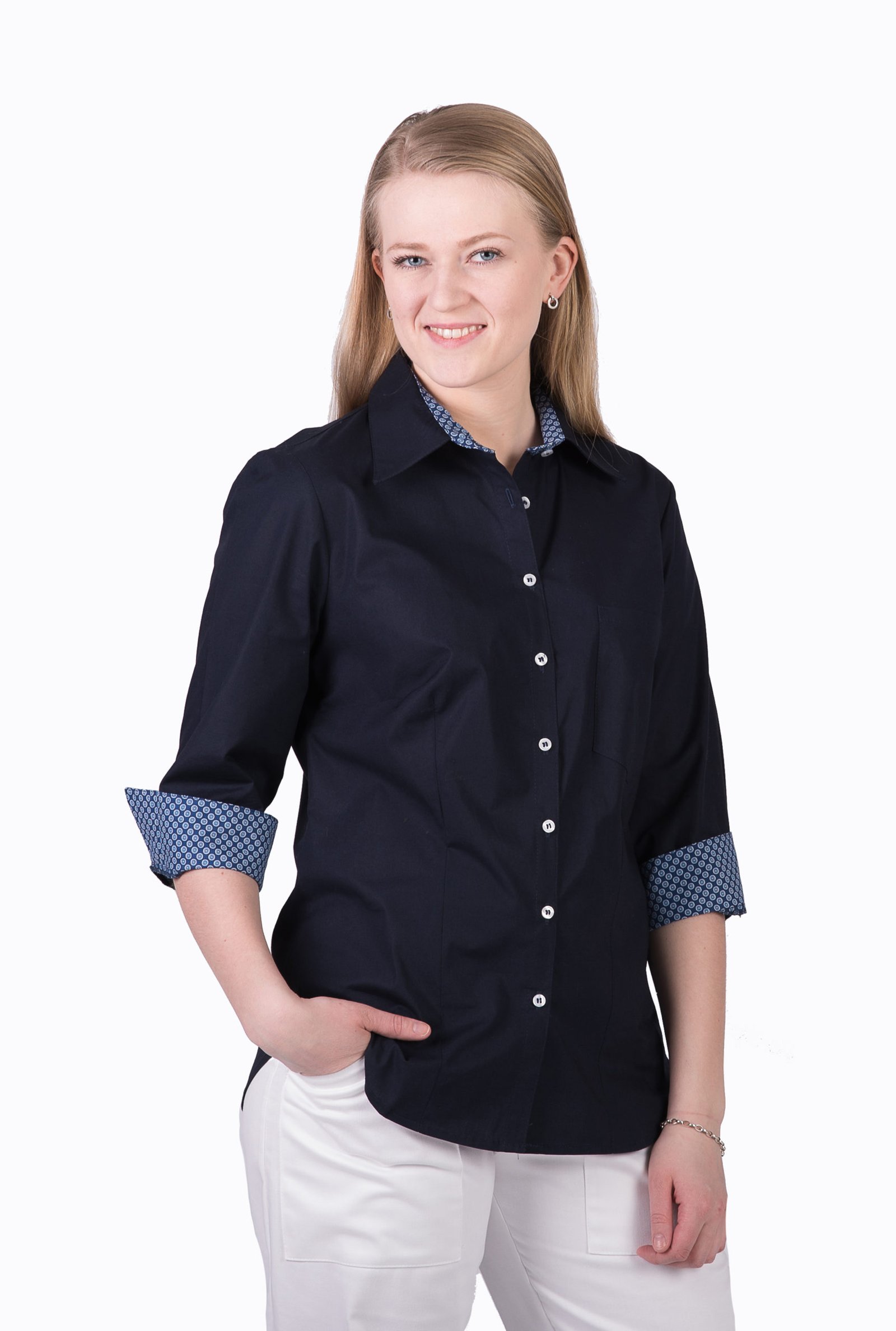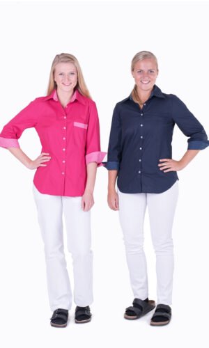 Damskjorta i figursydd modell med vanlig krage. Trekvartsärm och bröstficka, svängd i sidan. Kan beställas med stora fickor. Här ser vi skjortan med färgtillägg med dekortyg på krage, ficka och ärmkant. Färgtilläggskostnad tillkommer. Dekortygerna hittar du under fliken “Våra tyger”.