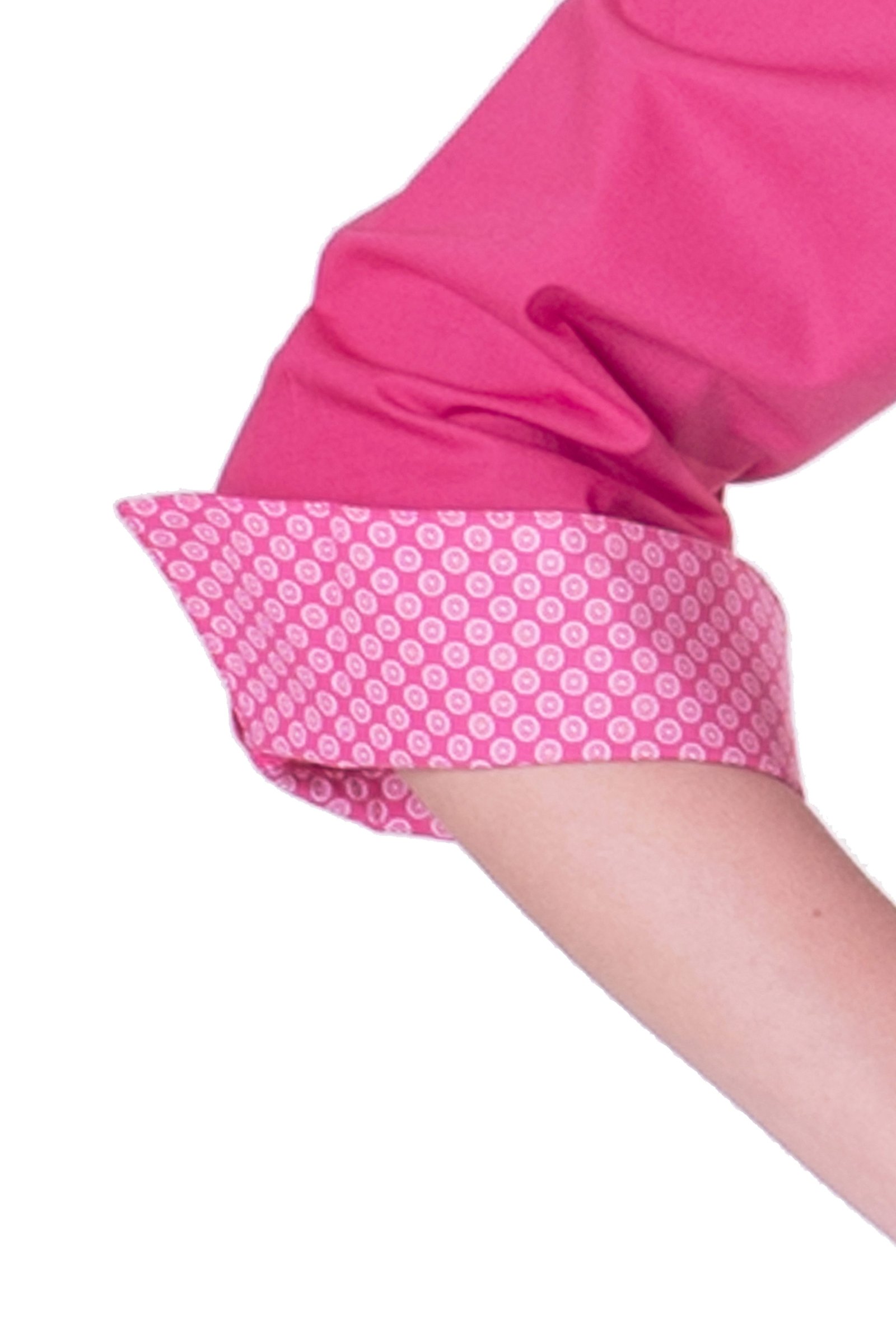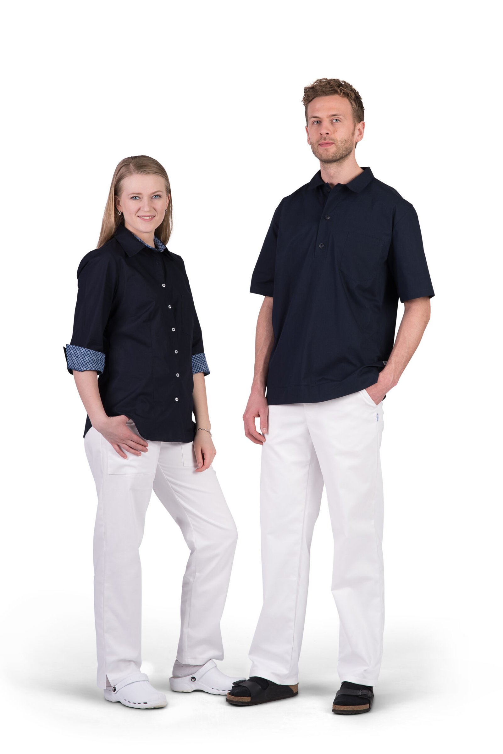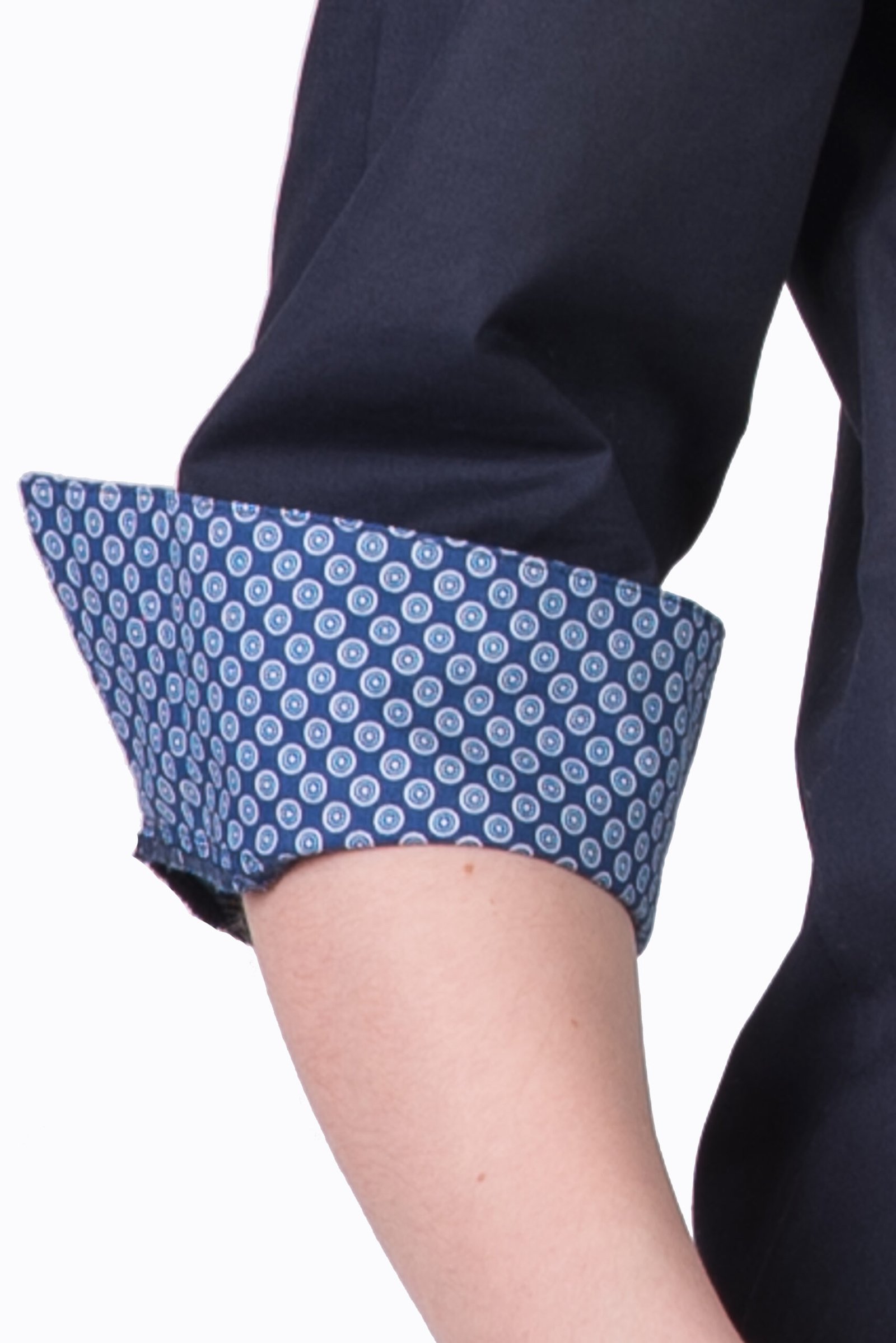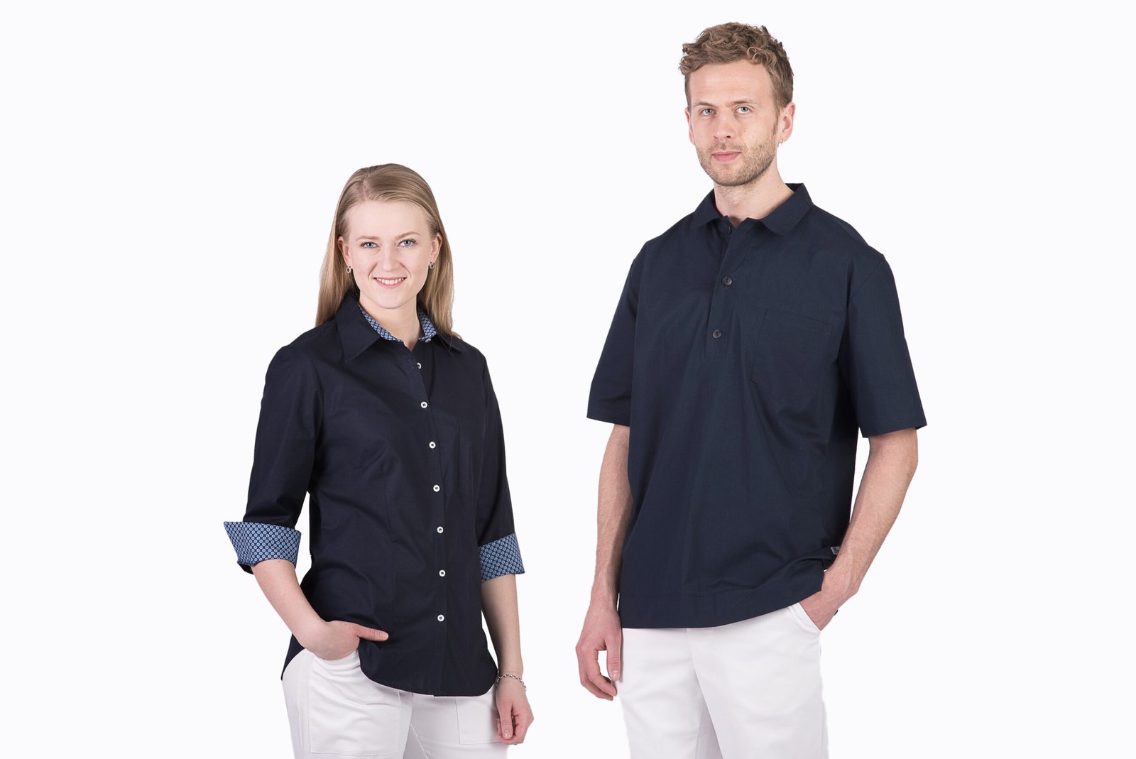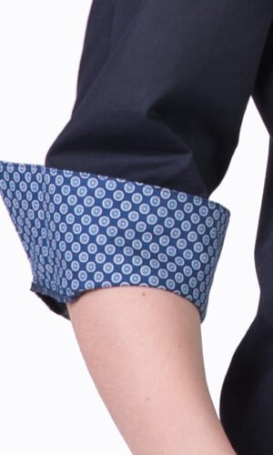 Damskjorta i figursydd modell med vanlig krage. Trekvartsärm och bröstficka, svängd i sidan. Kan beställas med stora fickor. Här ser vi skjortan med färgtillägg med dekortyg på krage, ficka och ärmkant. Färgtilläggskostnad tillkommer. Dekortygerna hittar du under fliken “Våra tyger”.
