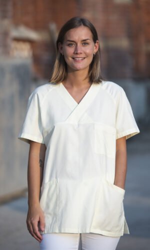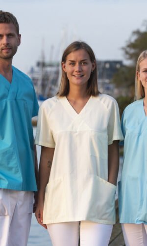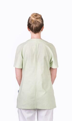 OP-tunika med kort raglanärm. Figursydd med bröstficka och två stora fickor samt sidsprund.