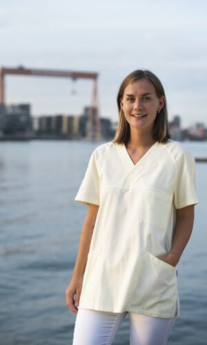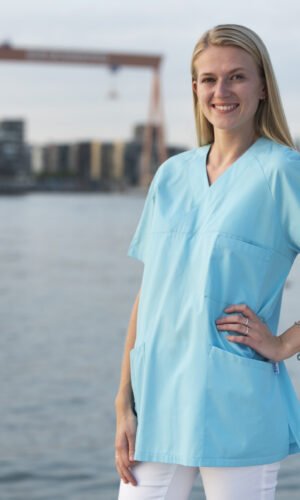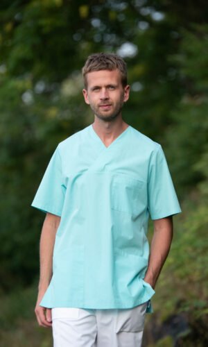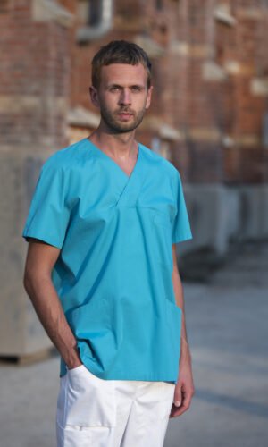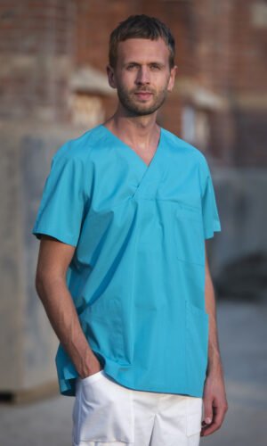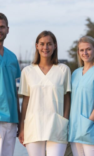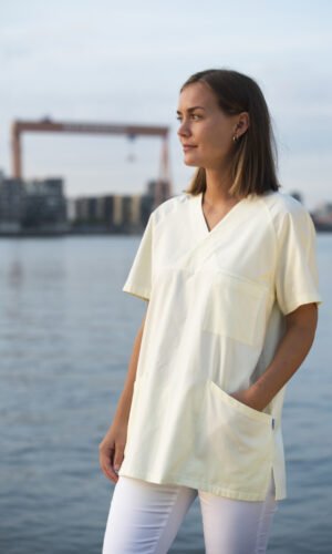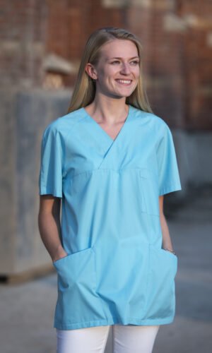 OP-skjorta med kort raglanärm. Rak modell med bröstficka och två stora fickor samt sidsprund.