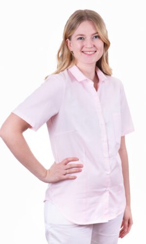 Damskjorta i figursydd modell med liten krage och kragstånd. Kort ärm, bröstficka och svängd i sidan. Modellen har lite mer generös vidd över byst och bål. Kan beställas med stora fickor.