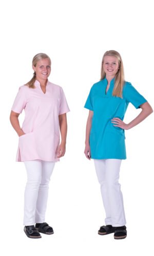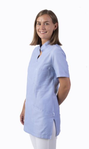 Figursydd, lite längre damtunika med liten ståkrage och kort ärm. Bröstficka, två stora fickor samt sidsprund.