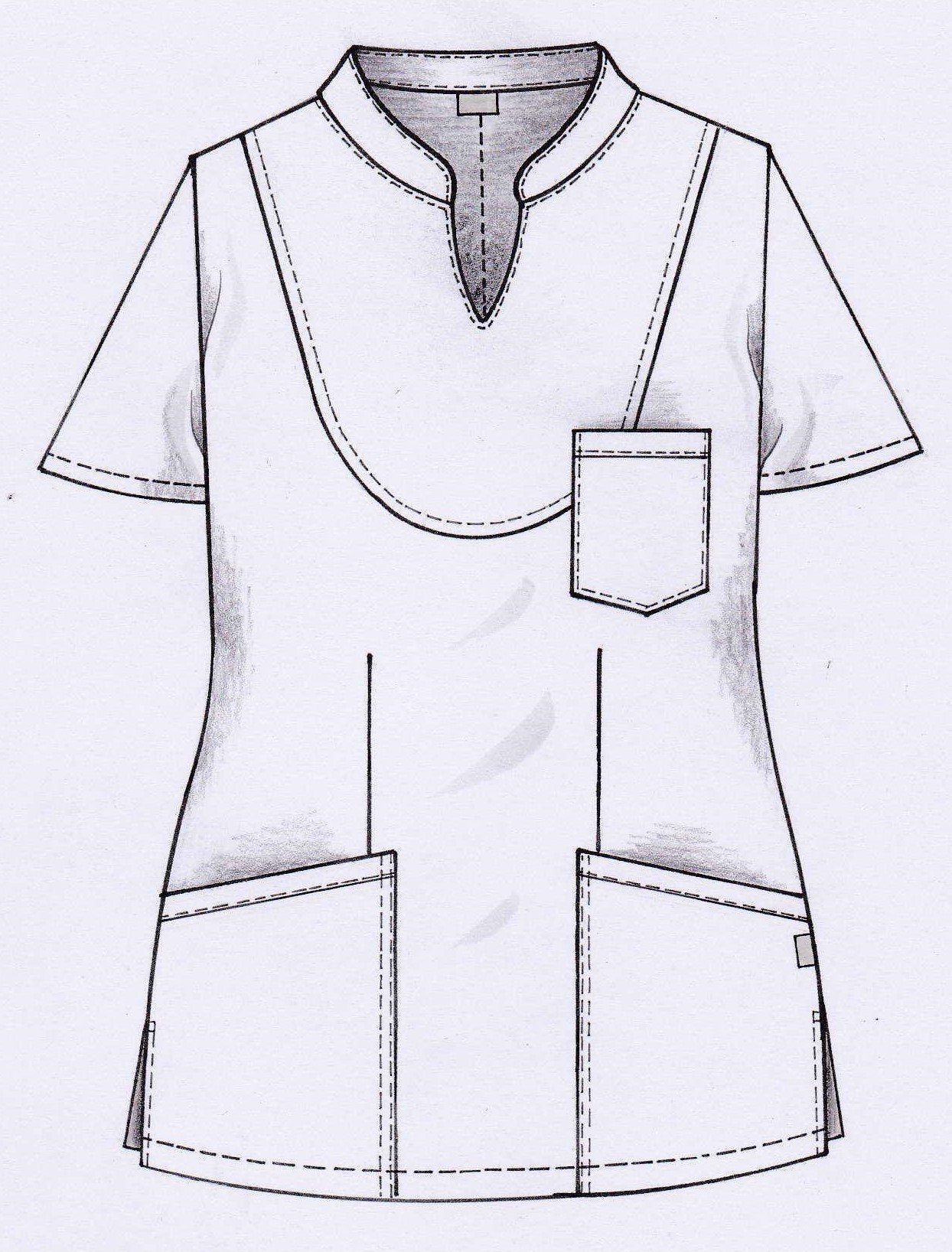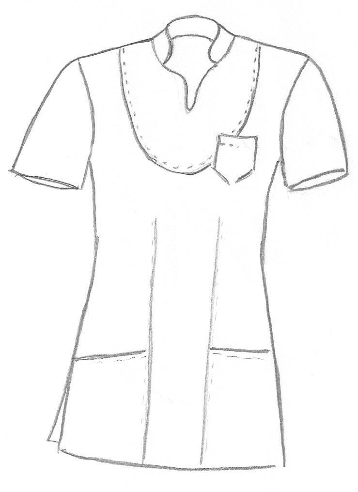 Figursydd, lite längre damtunika med liten ståkrage och kort ärm. Bröstficka, två stora fickor samt sidsprund.