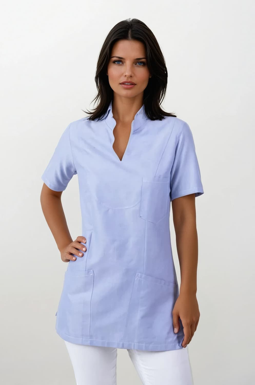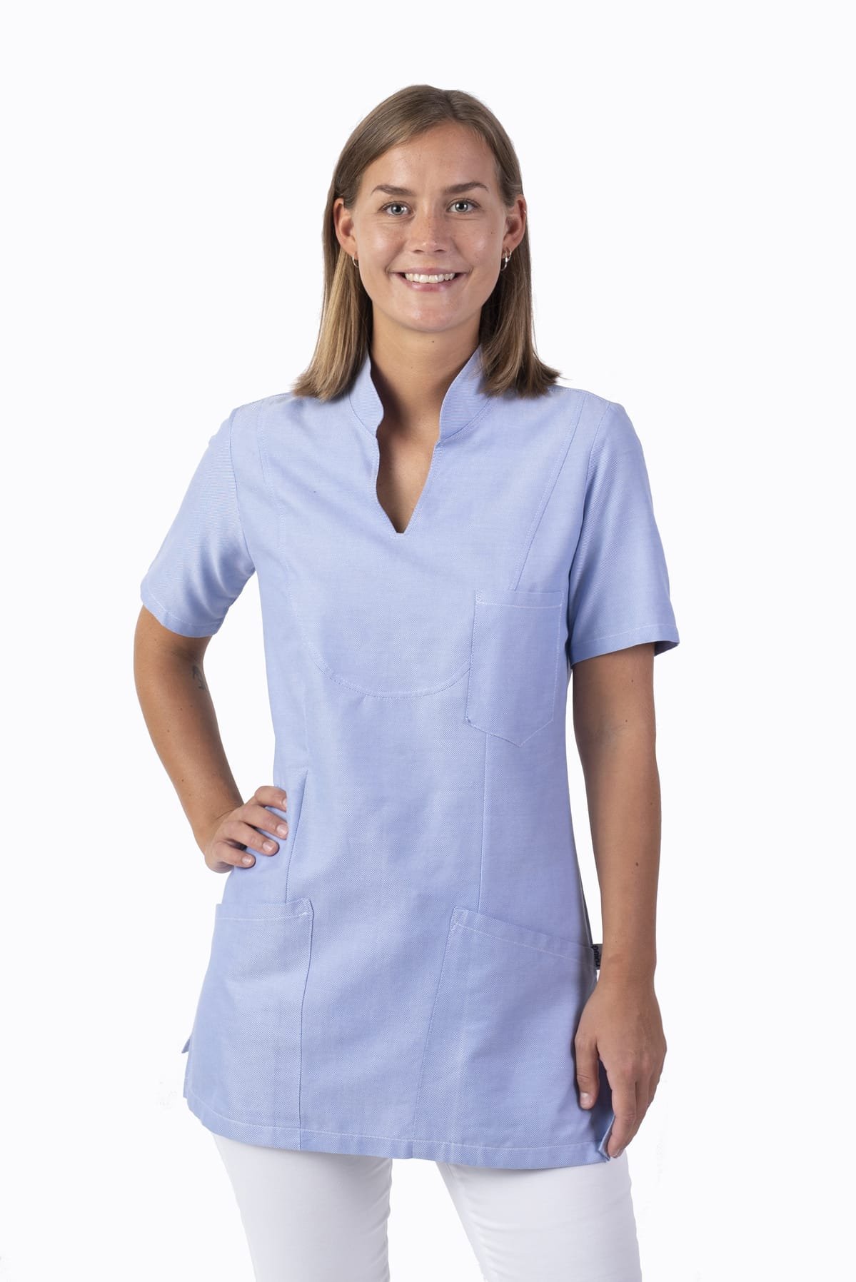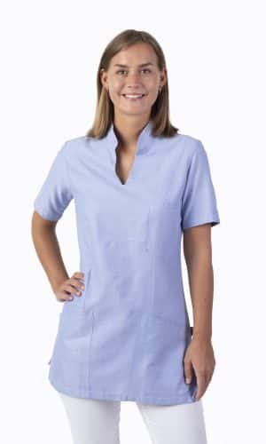 Figursydd, lite längre damtunika med liten ståkrage och kort ärm. Bröstficka, två stora fickor samt sidsprund.