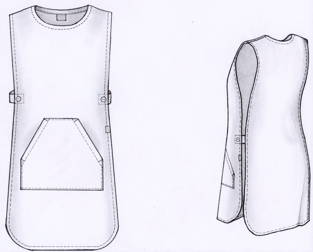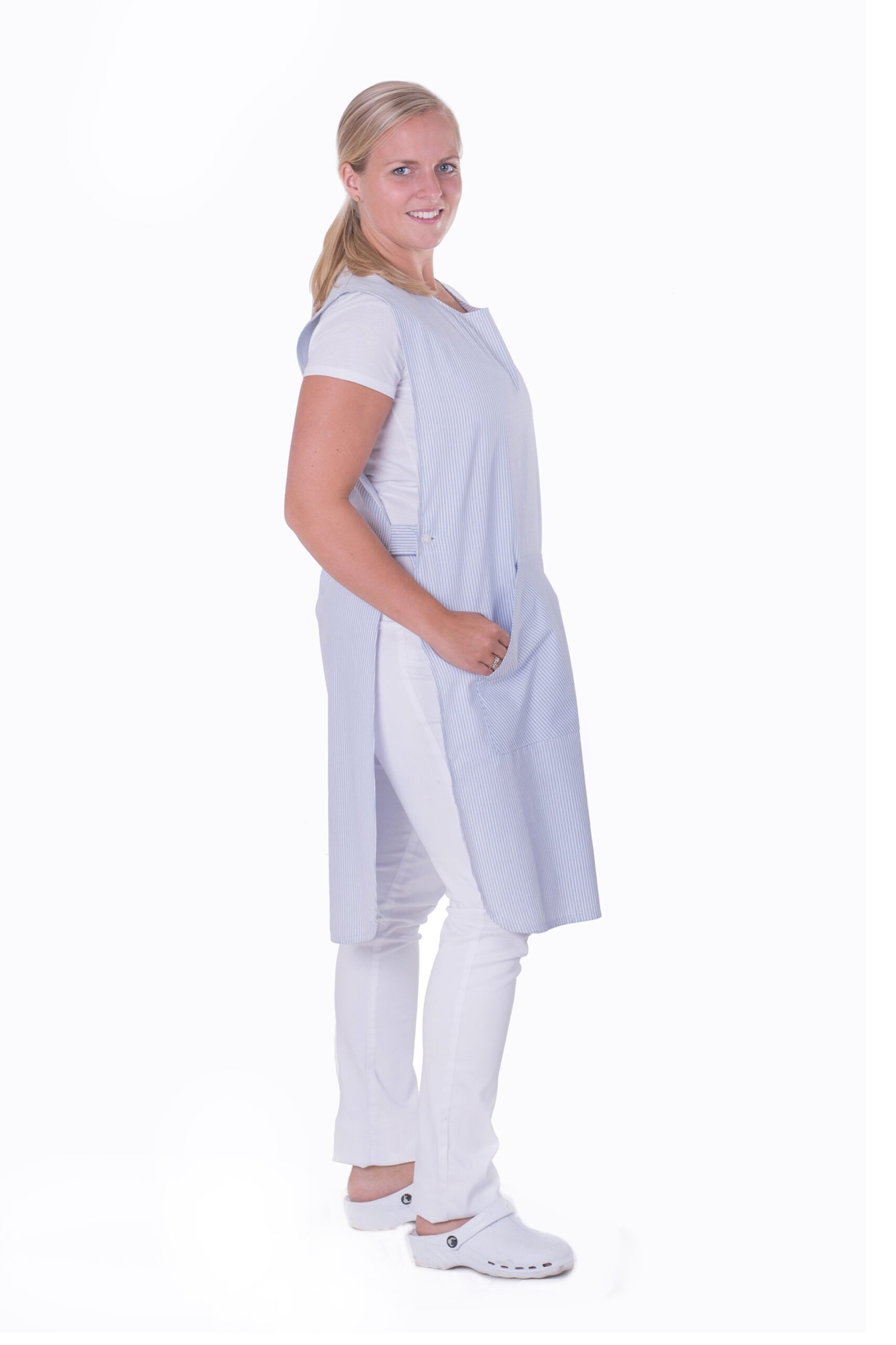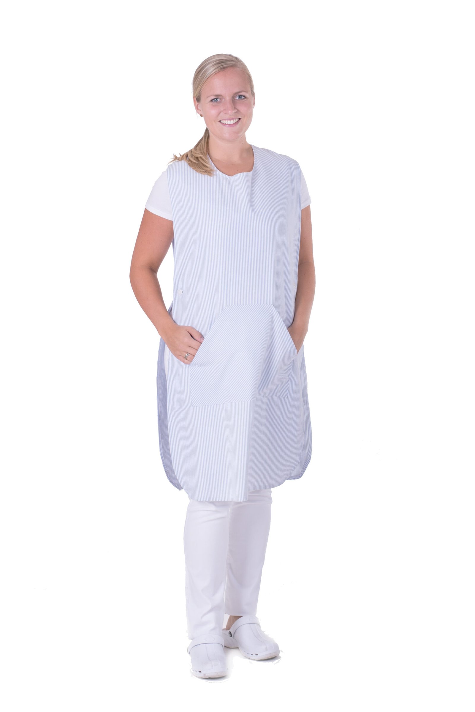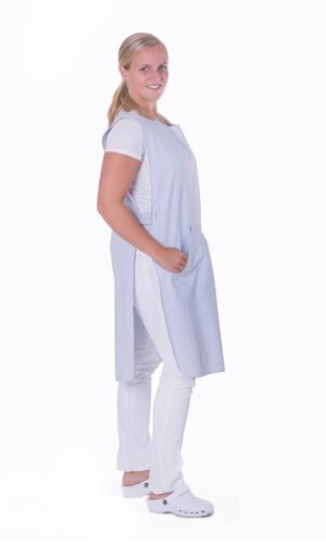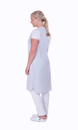 Skyddsförkläde med hel fram- och baksida. Knäppes i sidan och har en känguruficka fram. One size.