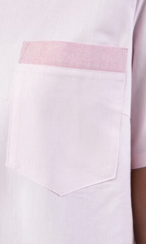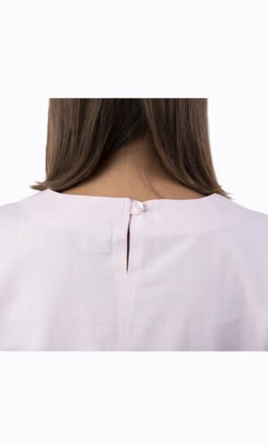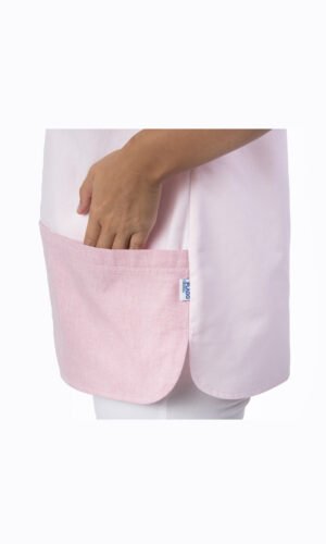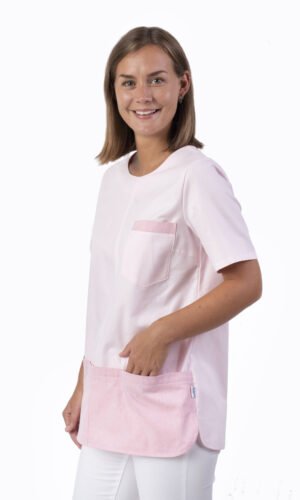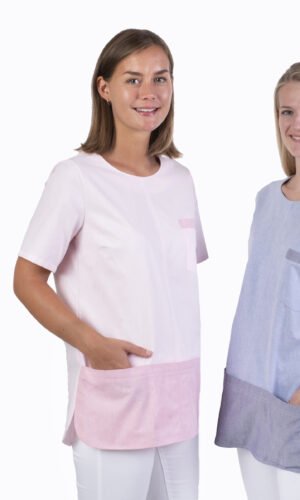 Rundhalsad kort-ärmad damtunika i rak modell med fint svängt nedre parti. Fickpartiet nertill innehåller tre st fickor och är sydd i kontrastfärg tillsammans med bröstfickans kant. Stänges med liten knapp bak.