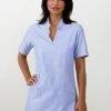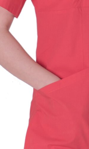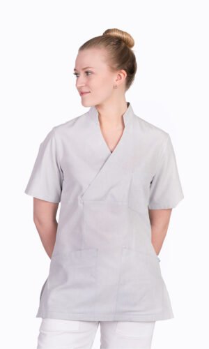 Damtunika i figursydd modell med ståkrage, kort ärm och bröstficka. Rak nertill, två stora fickor och sidsprund.