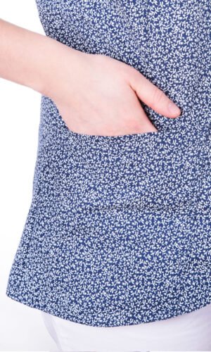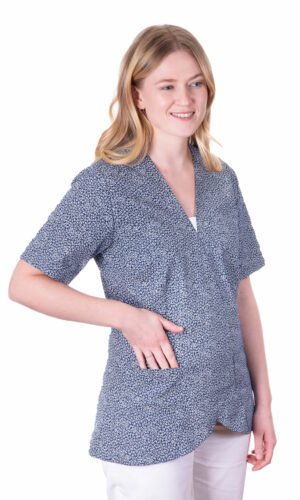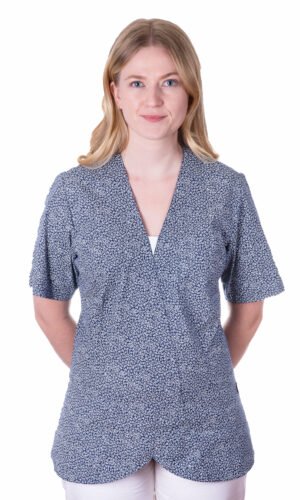 Nära figursydd damtunika i omlottmodell. Kil mitt fram i vitt (önskas annan färg, kontakta oss). Kort ärm och bröstficka samt två sidfickor. OBS: Notera att denna modell är lite snävare i utformningen. Ta del av plagg-måtten längst ner för att kontrollera att du väljer rätt storlek.