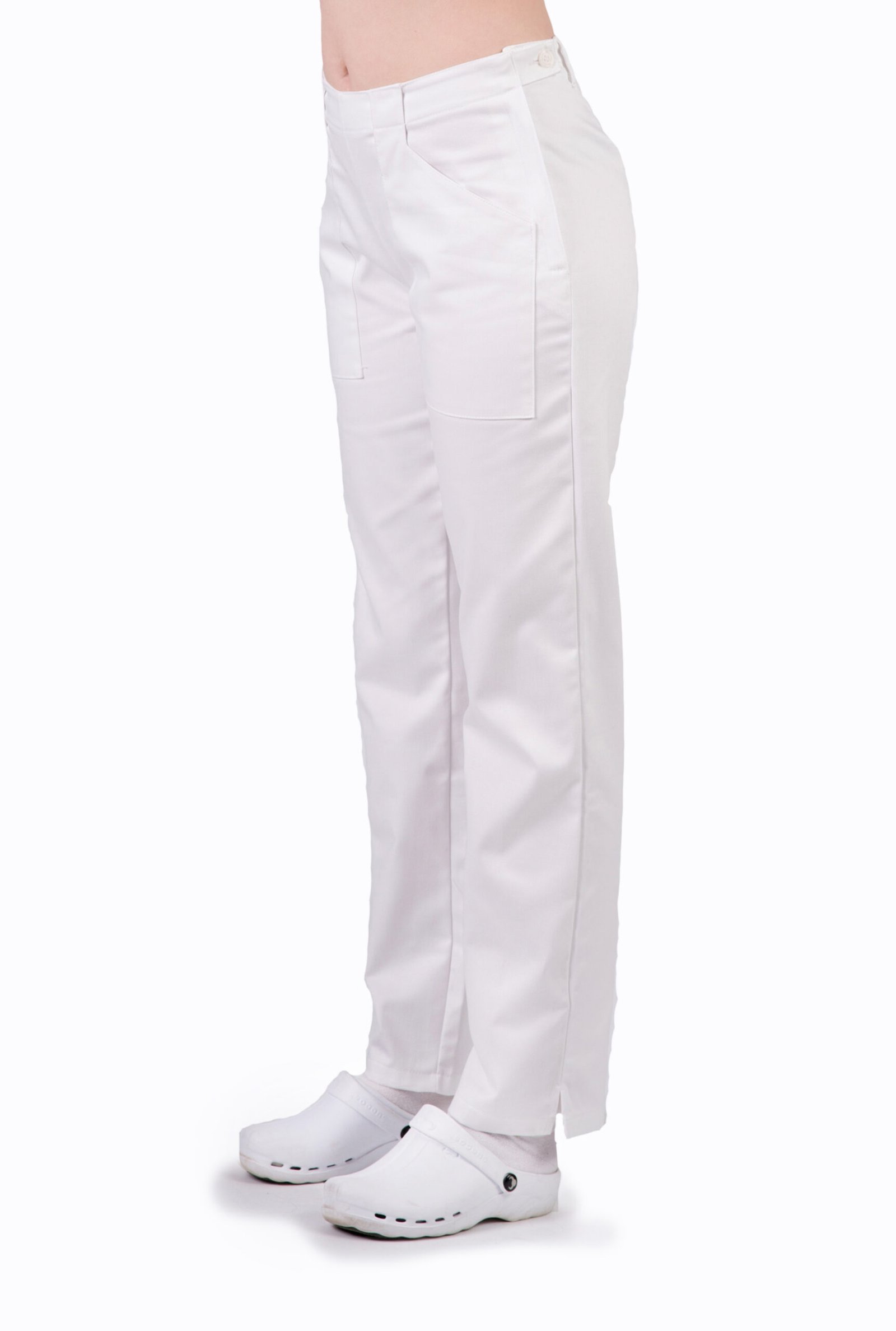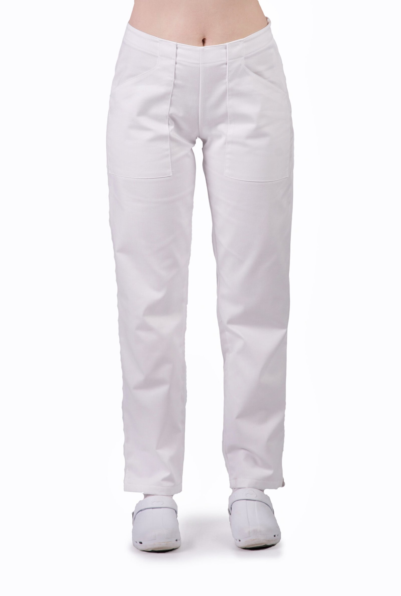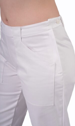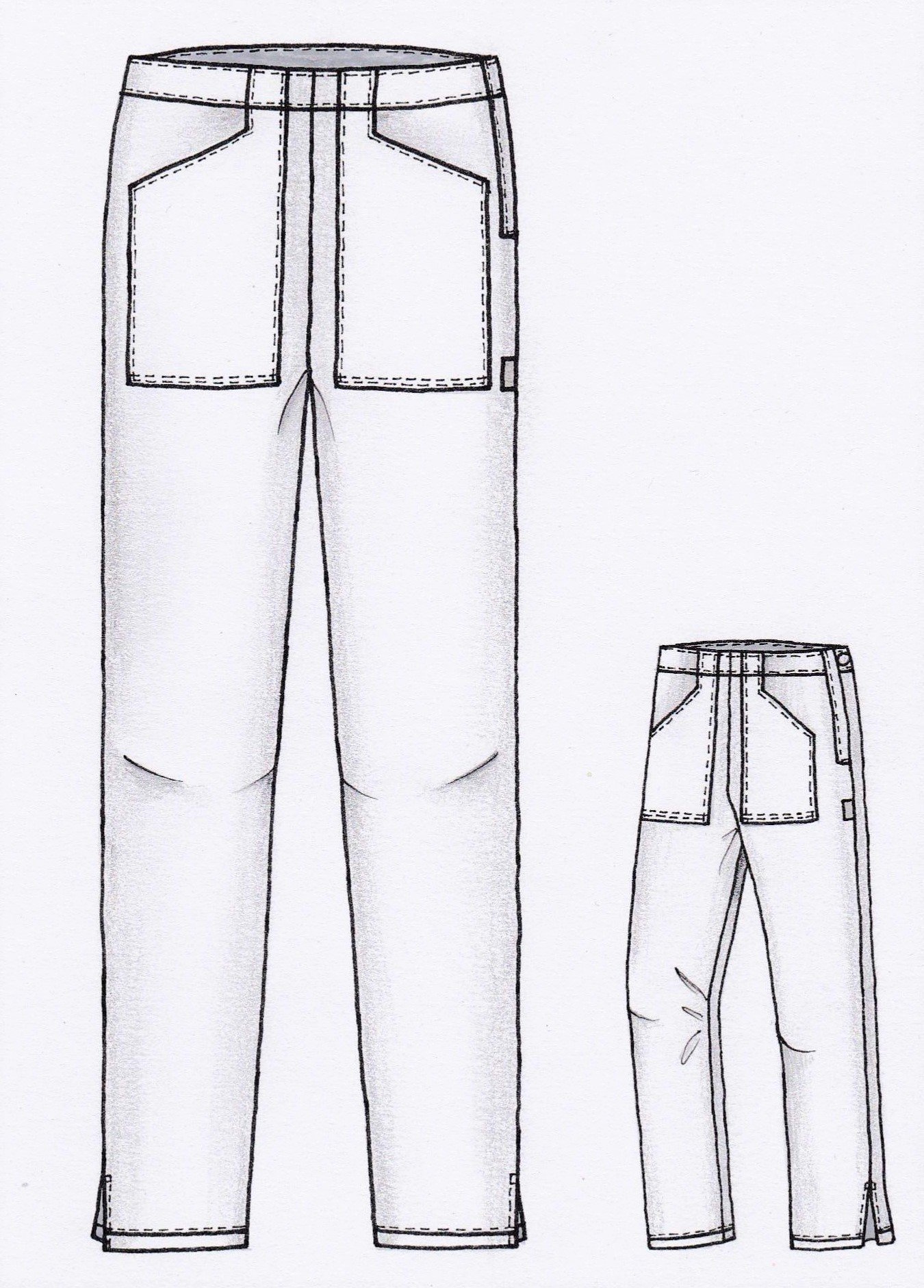 Byxa i smal modell. Dragkedja i sidan och stora framfickor. Hällor. Aning kortare modell med sprund nertill och smal fotvidd.