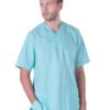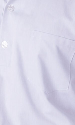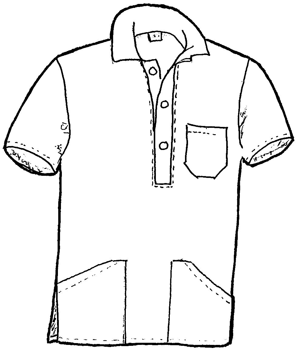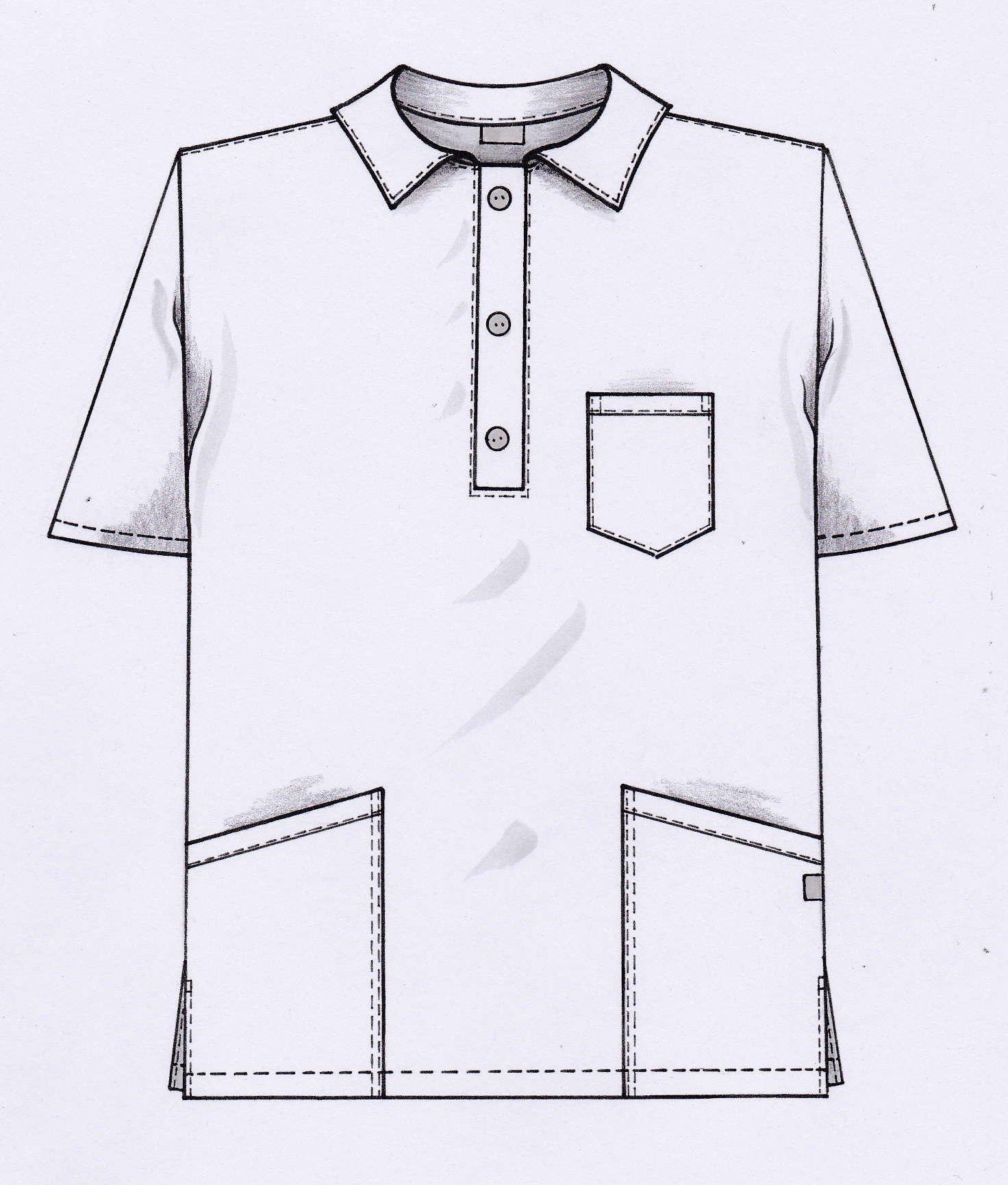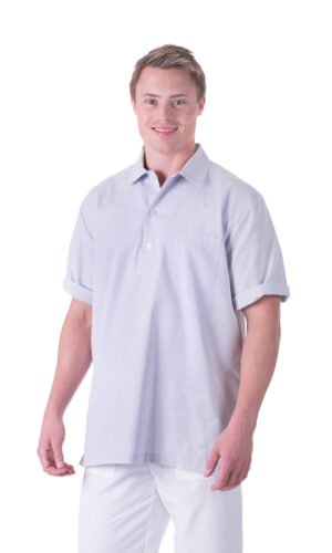 Herrbussarong i rak modell med krage och knappslå, bröstficka och två stora fickor fram.