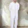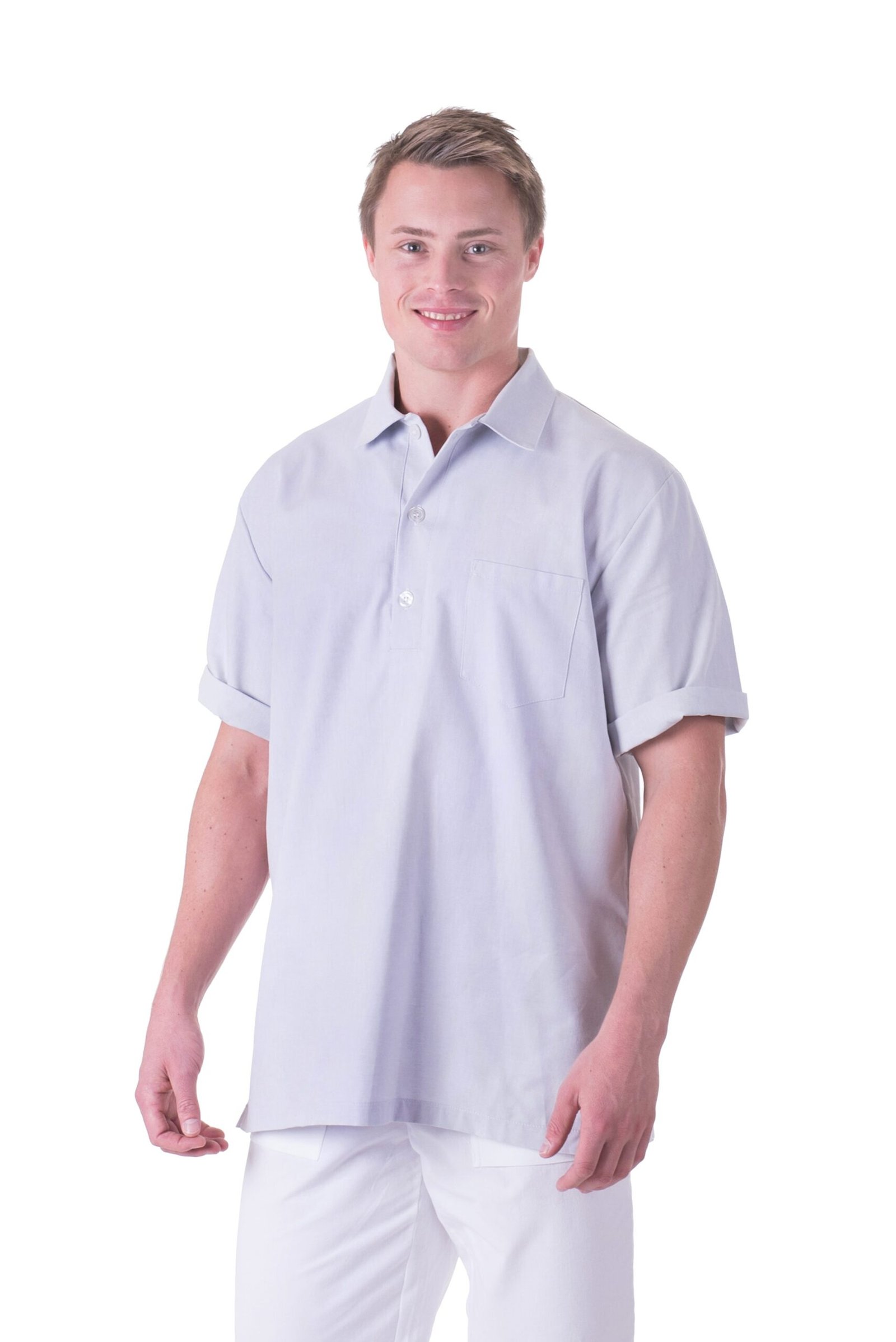 Herrbussarong i rak modell med krage och knappslå, bröstficka och två stora fickor fram.