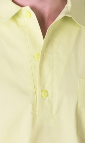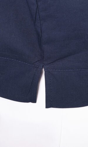 Herrbussarong i rak modell med krage och knappslå fram samt bröstficka. Avslutas nertill med en 5 cm bred kant samt sprund i sidan.
