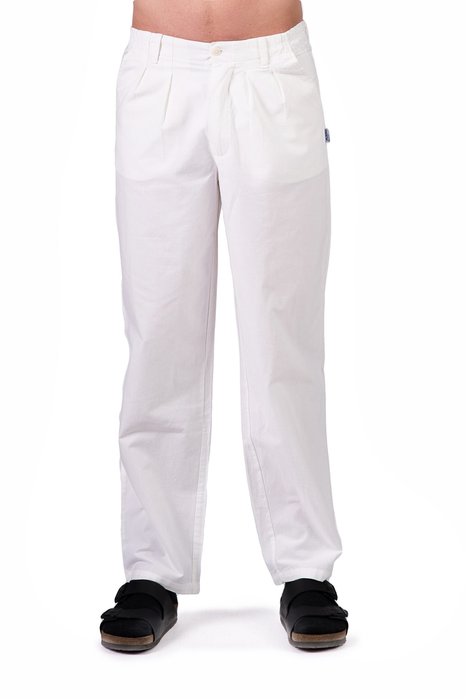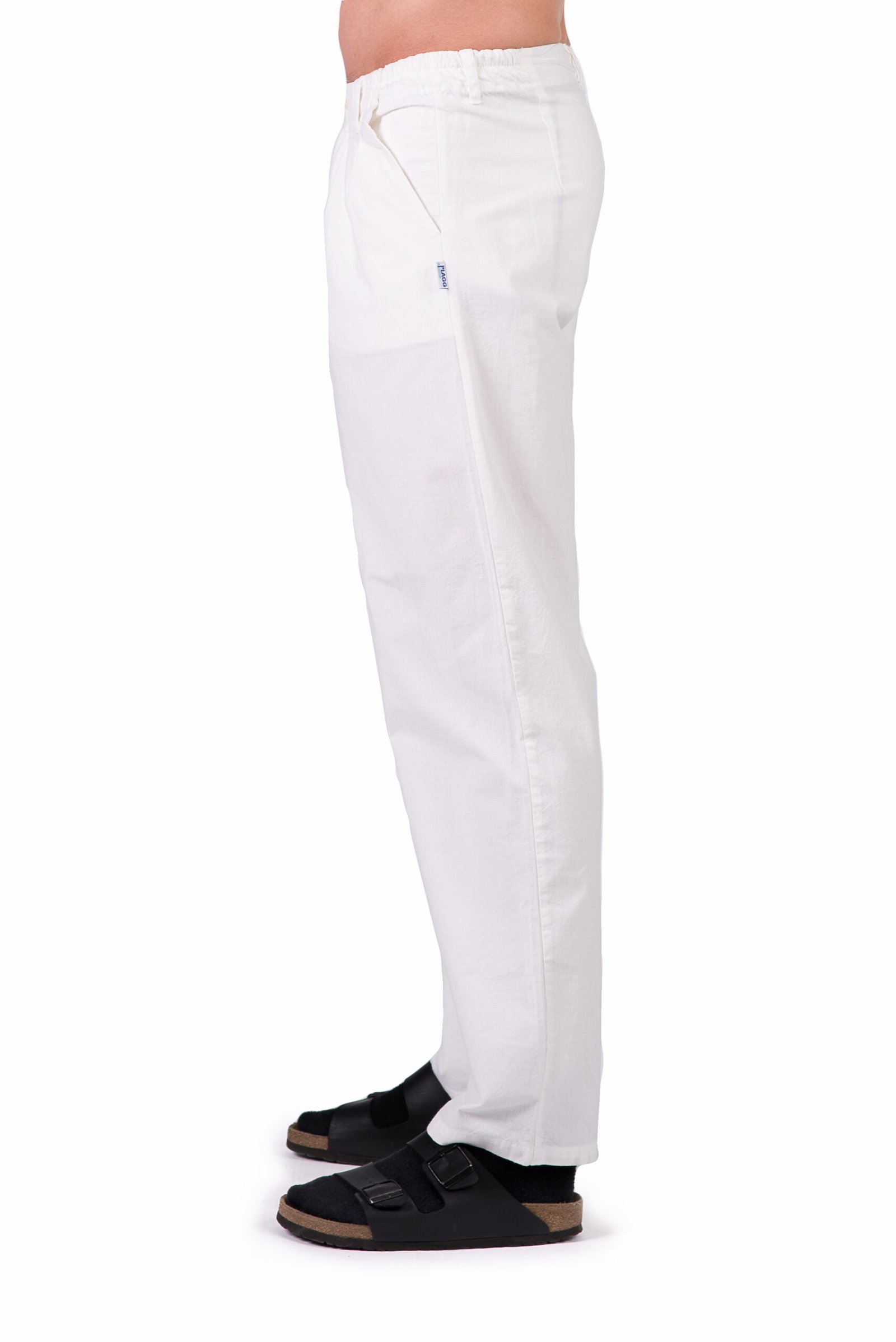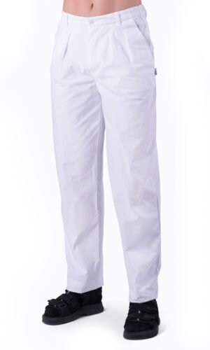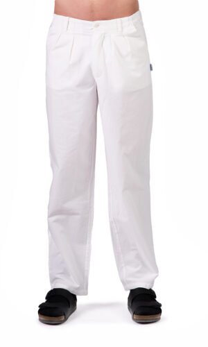 Herrbyxa med god benvidd, modell med gylf och två veck fram, snedställda sidfickor och resår i sidan samt hällor.