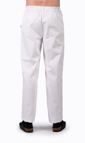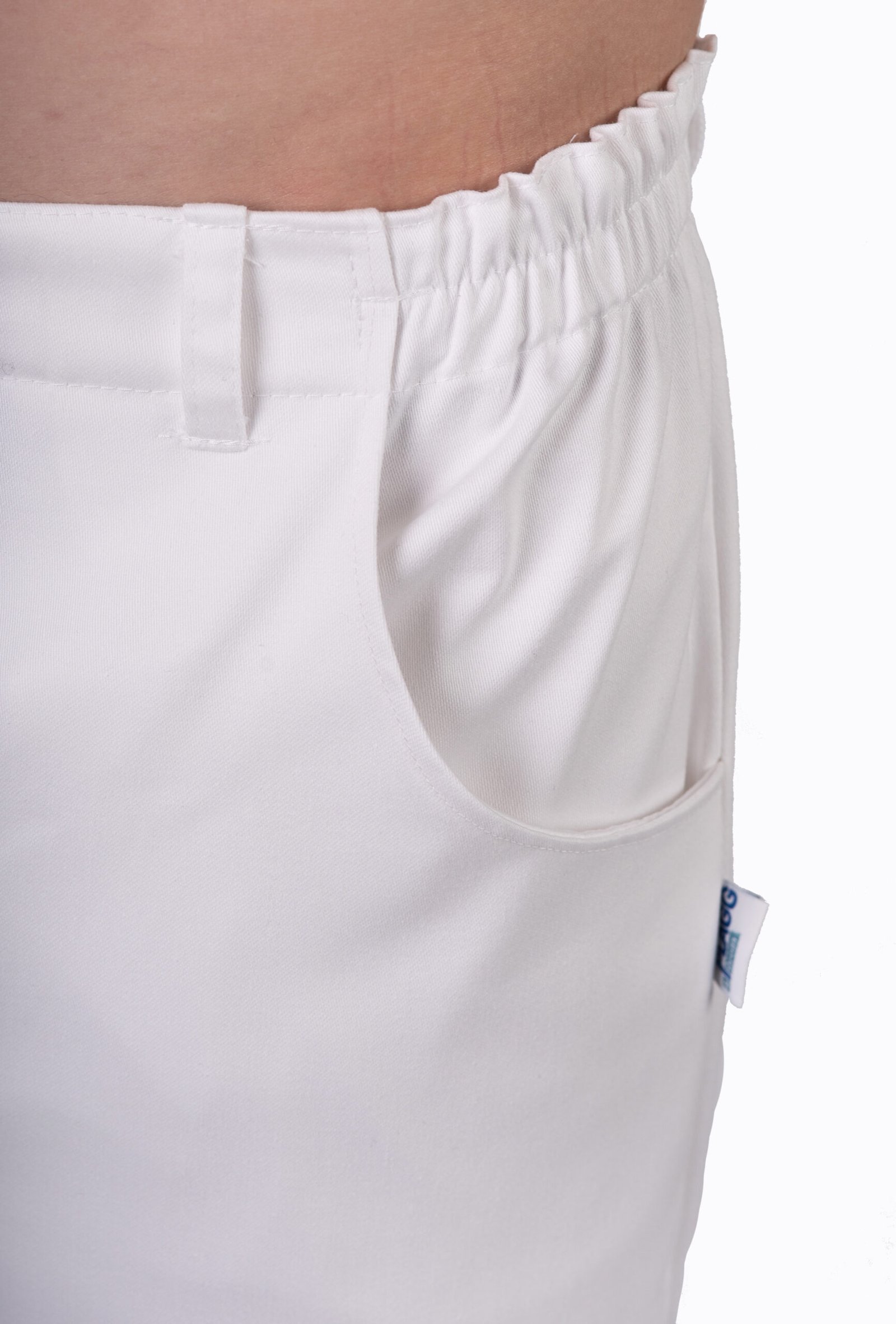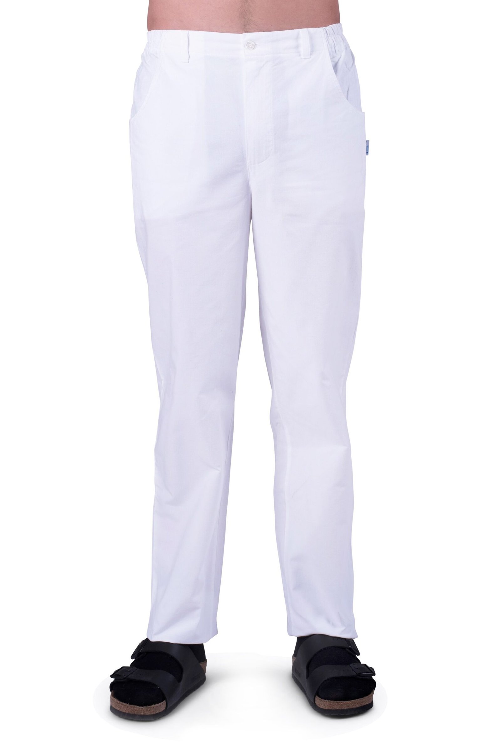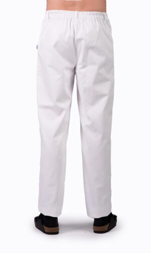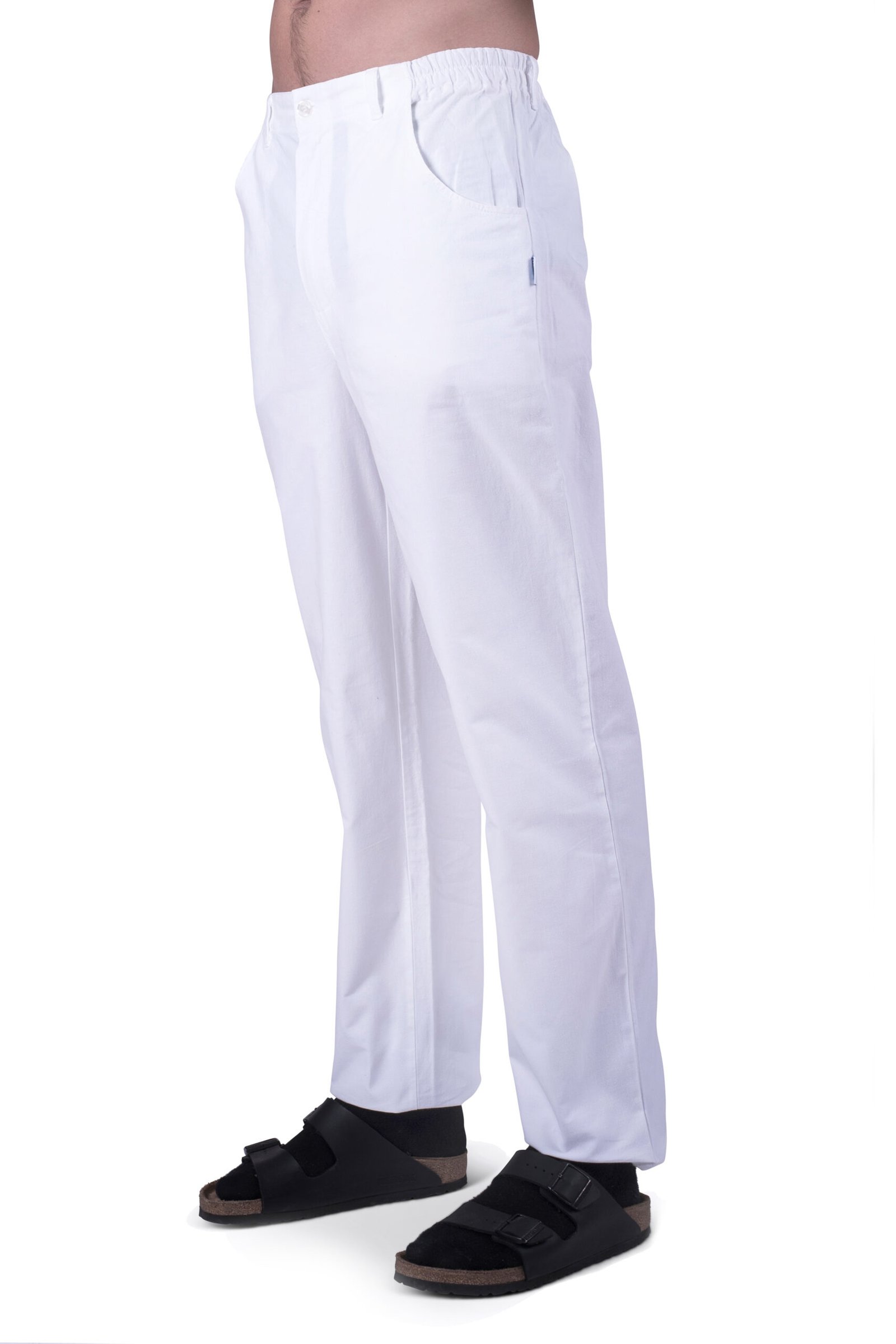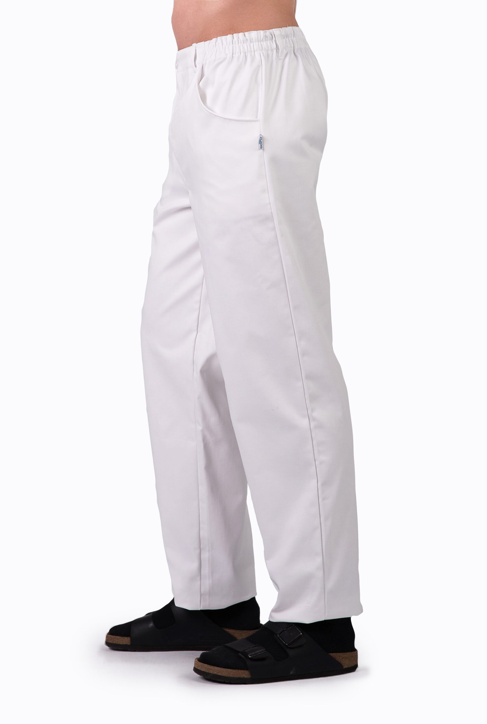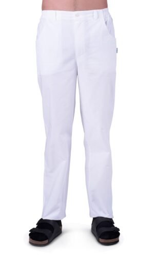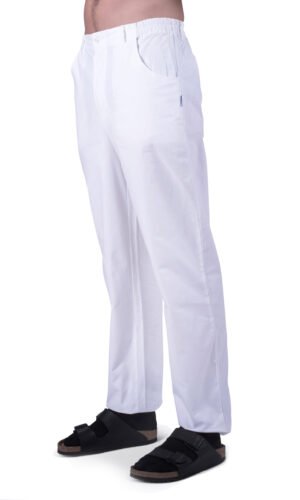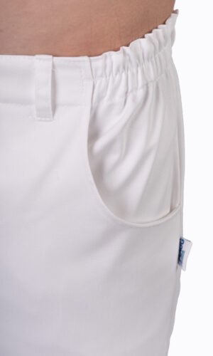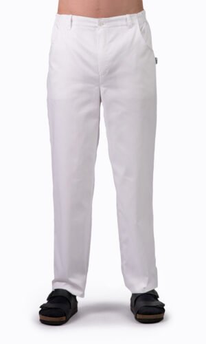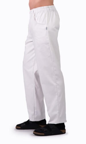 Herr- / unisexbyxa med god benvidd, gylf och rundade sidfickor fram, resår bak och i sidan samt hällor.
