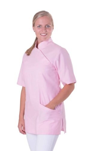 Lite längre figursydd damtunika med ståkrage och sned knäppning fram. Kort ärm och bröstficka på höger sida. Två stora fickor fram samt sidsprund.