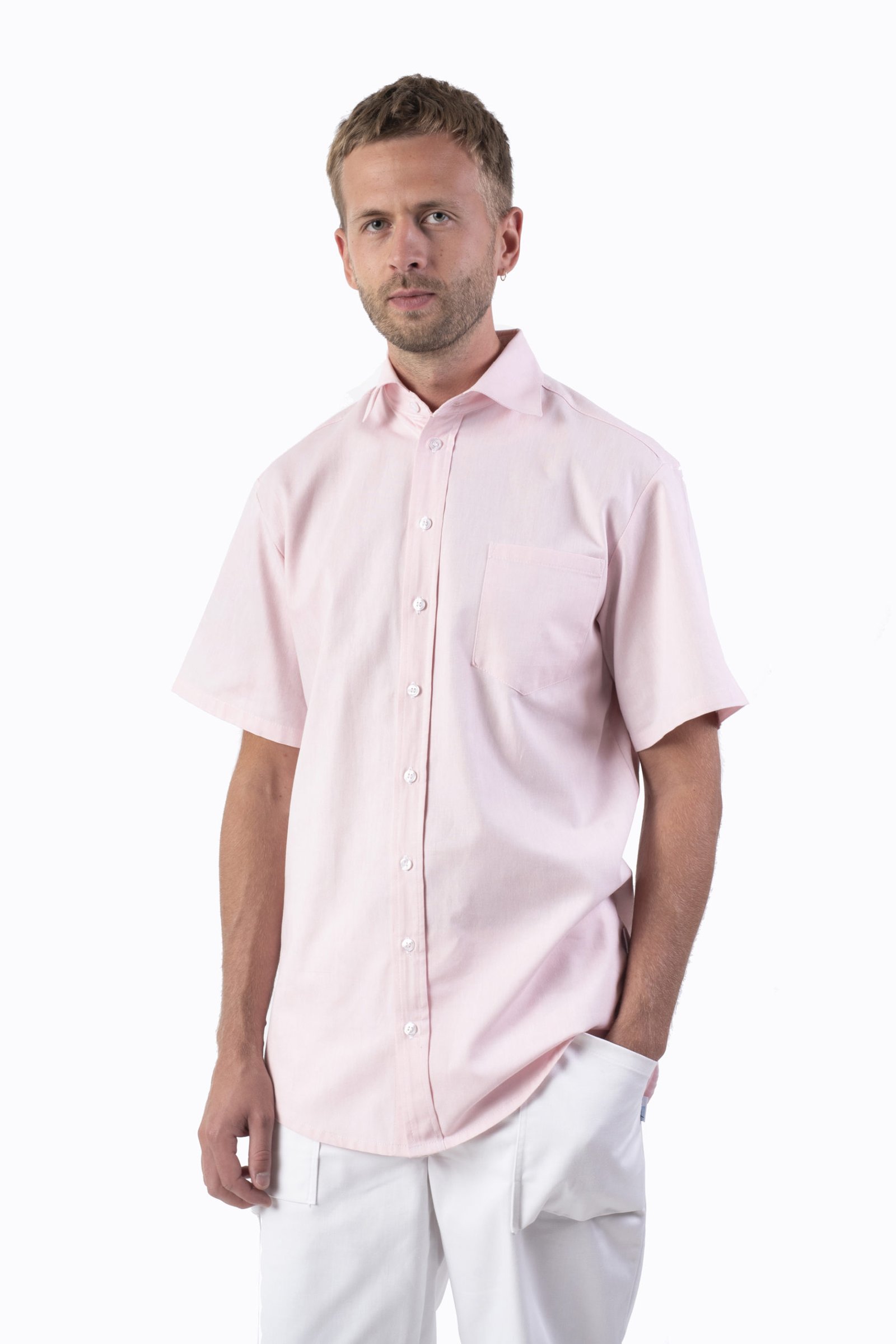 Figursydd herrskjorta med ok bak samt svagt rundad nertill. Kort ärm och bröstficka.